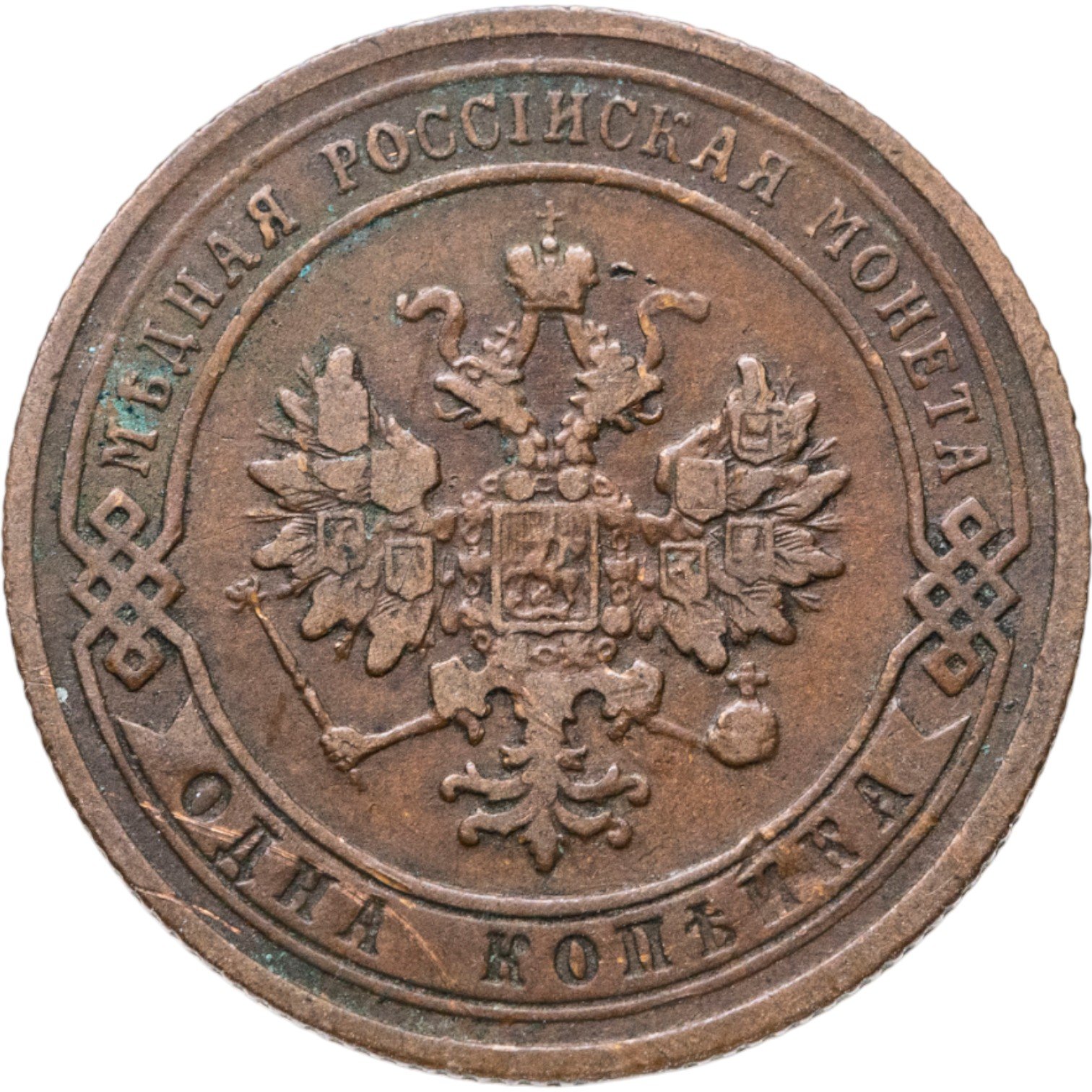 В центре монеты изображен Малый Государственный Герб Российской империи - двуглавый орел, головы которого увенчаны двумя коронами, третья, большая корона над ними. Все они соединены лентой Андрея Первозванного. В правой лапе орла – скипетр, в левой – держава. На его груди расположен Московский герб, в щите изображен Георгий Победоносец с копьем поражающий дракона. Вокруг щита цепь ордена Св. Апостола Андрея Первозванного. На крыльях орла изображены гербы: Царства Казанского, Польского, Херсонеса Таврического, Астраханского, Сибирского, Грузинского и герб соединенных княжеств Киевского, Новгородского и Владимирского — по 4 на каждое крыло. По окружности - две полукруглые плашки, соединенные узорами. На верхней плашке выпуклая надпись: "МЕДНАЯ РОССИЙСКАЯ МОНЕТА". На нижней плашке, изображенной в виде ленты, углубленная надпись: "ОДНА КОПЕЙКА".