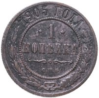 В центре указан номинал — цифра «1», ограниченная с обеих сторон звездочками. Под цифрой номинала — слово "КОПЕЙКА". Ниже, расположен декоративный разделитель в виде двух изогнутых линий и небольшой окружности между ними. Под разделителем — обозначение монетного двора «С.П.Б.». Центральная часть отделена от остального изображения, окружностью в виде точек. В верхней части полукругом углубленная надпись: "1905 ГОДА". Ниже этой надписи, вдоль канта, изображен венок из лавровой и дубовой ветвей, которые, в нижней части, перевязаны лентой на узел бантом.