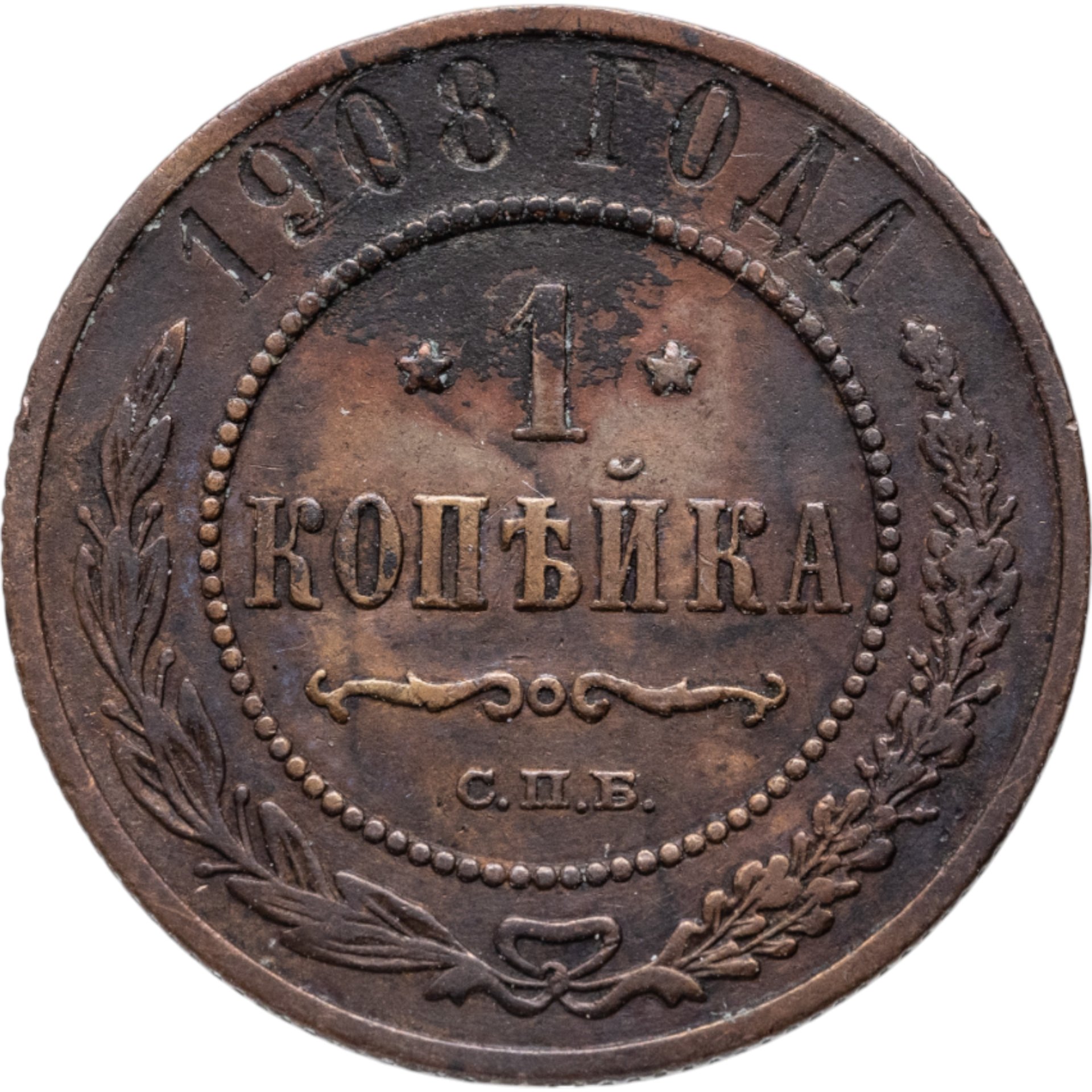 В центре указан номинал — цифра «1», ограниченная с обеих сторон звездочками. Под цифрой номинала — слово "КОПЕЙКА". Ниже, расположен декоративный разделитель в виде двух изогнутых линий и небольшой окружности между ними. Под разделителем — обозначение монетного двора «С.П.Б.». Центральная часть отделена от остального изображения, окружностью в виде точек. В верхней части полукругом углубленная надпись: "1908 ГОДА". Ниже этой надписи, вдоль канта, изображен венок из лавровой и дубовой ветвей, которые, в нижней части, перевязаны лентой на узел бантом.
