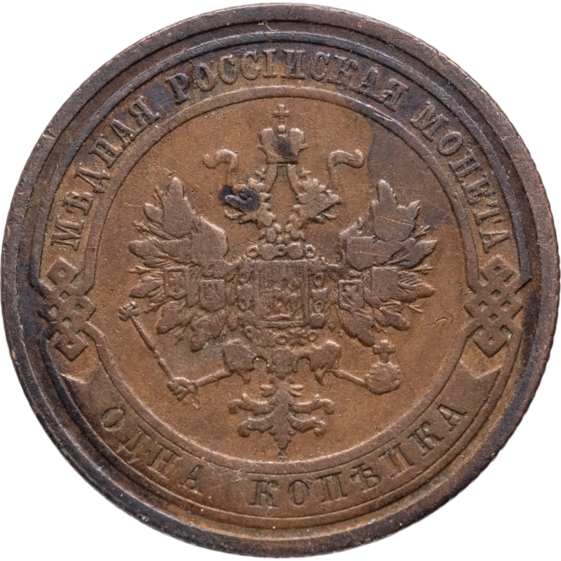 В центре монеты изображен Малый Государственный Герб Российской империи - двуглавый орел, головы которого увенчаны двумя коронами, третья, большая корона над ними. Все они соединены лентой Андрея Первозванного. В правой лапе орла – скипетр, в левой – держава. На его груди расположен Московский герб, в щите изображен Георгий Победоносец с копьем поражающий дракона. Вокруг щита цепь ордена Св. Апостола Андрея Первозванного. На крыльях орла изображены гербы: Царства Казанского, Польского, Херсонеса Таврического, Астраханского, Сибирского, Грузинского и герб соединенных княжеств Киевского, Новгородского и Владимирского — по 4 на каждое крыло. По окружности - две полукруглые плашки, соединенные узорами. На верхней плашке выпуклая надпись: "МЕДНАЯ РОССИЙСКАЯ МОНЕТА". На нижней плашке, изображенной в виде ленты, углубленная надпись: "ОДНА КОПЕЙКА".
