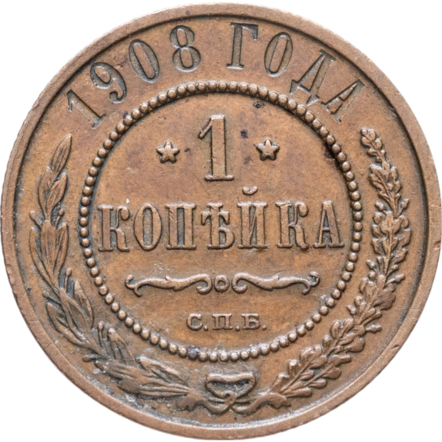 В центре указан номинал — цифра «1», ограниченная с обеих сторон звездочками. Под цифрой номинала — слово "КОПЕЙКА". Ниже, расположен декоративный разделитель в виде двух изогнутых линий и небольшой окружности между ними. Под разделителем — обозначение монетного двора «С.П.Б.». Центральная часть отделена от остального изображения, окружностью в виде точек. В верхней части полукругом углубленная надпись: "1908 ГОДА". Ниже этой надписи, вдоль канта, изображен венок из лавровой и дубовой ветвей, которые, в нижней части, перевязаны лентой на узел бантом.
