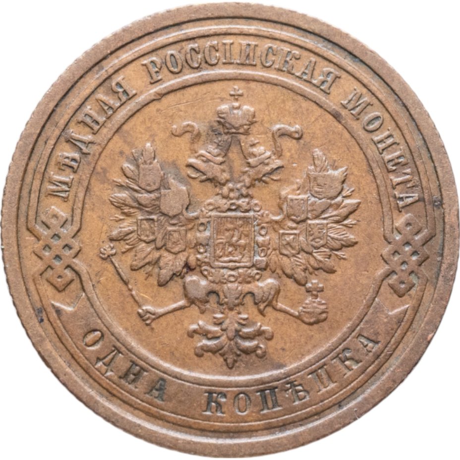 В центре монеты изображен Малый Государственный Герб Российской империи - двуглавый орел, головы которого увенчаны двумя коронами, третья, большая корона над ними. Все они соединены лентой Андрея Первозванного. В правой лапе орла – скипетр, в левой – держава. На его груди расположен Московский герб, в щите изображен Георгий Победоносец с копьем поражающий дракона. Вокруг щита цепь ордена Св. Апостола Андрея Первозванного. На крыльях орла изображены гербы: Царства Казанского, Польского, Херсонеса Таврического, Астраханского, Сибирского, Грузинского и герб соединенных княжеств Киевского, Новгородского и Владимирского — по 4 на каждое крыло. По окружности - две полукруглые плашки, соединенные узорами. На верхней плашке выпуклая надпись: "МЕДНАЯ РОССИЙСКАЯ МОНЕТА". На нижней плашке, изображенной в виде ленты, углубленная надпись: "ОДНА КОПЕЙКА".