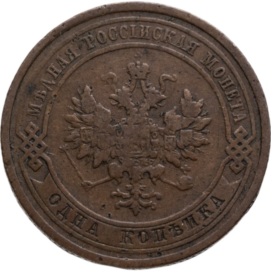 В центре монеты изображен Малый Государственный Герб Российской империи - двуглавый орел, головы которого увенчаны двумя коронами, третья, большая корона над ними. Все они соединены лентой Андрея Первозванного. В правой лапе орла – скипетр, в левой – держава. На его груди расположен Московский герб, в щите изображен Георгий Победоносец с копьем поражающий дракона. Вокруг щита цепь ордена Св. Апостола Андрея Первозванного. На крыльях орла изображены гербы: Царства Казанского, Польского, Херсонеса Таврического, Астраханского, Сибирского, Грузинского и герб соединенных княжеств Киевского, Новгородского и Владимирского — по 4 на каждое крыло. По окружности - две полукруглые плашки, соединенные узорами. На верхней плашке выпуклая надпись: "МЕДНАЯ РОССИЙСКАЯ МОНЕТА". На нижней плашке, изображенной в виде ленты, углубленная надпись: "ОДНА КОПЕЙКА".