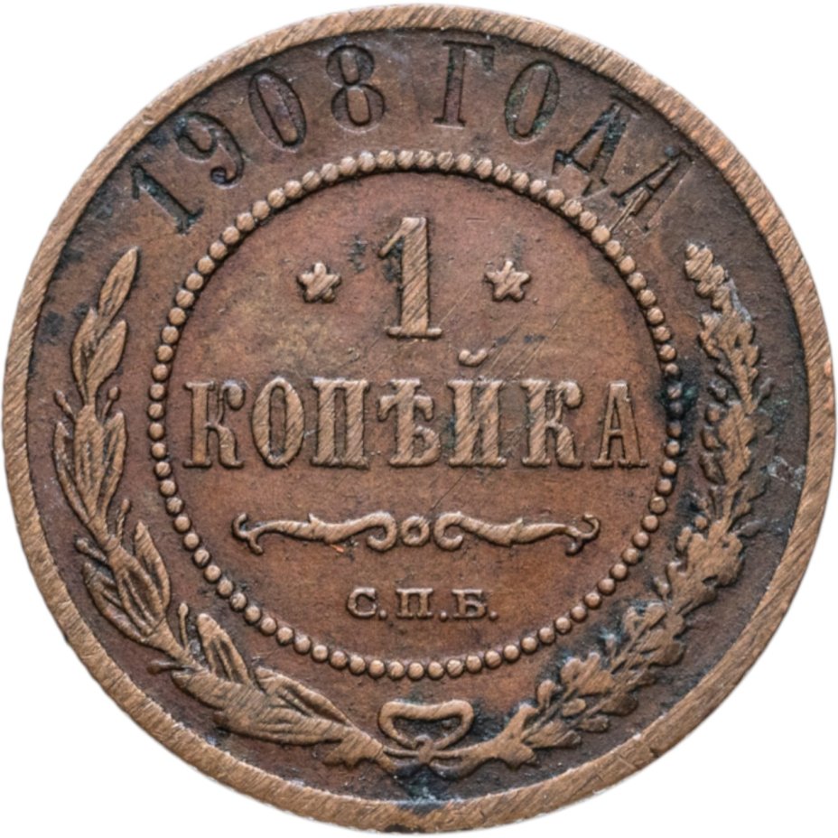 В центре указан номинал — цифра «1», ограниченная с обеих сторон звездочками. Под цифрой номинала — слово "КОПЕЙКА". Ниже, расположен декоративный разделитель в виде двух изогнутых линий и небольшой окружности между ними. Под разделителем — обозначение монетного двора «С.П.Б.». Центральная часть отделена от остального изображения, окружностью в виде точек. В верхней части полукругом углубленная надпись: "1908 ГОДА". Ниже этой надписи, вдоль канта, изображен венок из лавровой и дубовой ветвей, которые, в нижней части, перевязаны лентой на узел бантом.