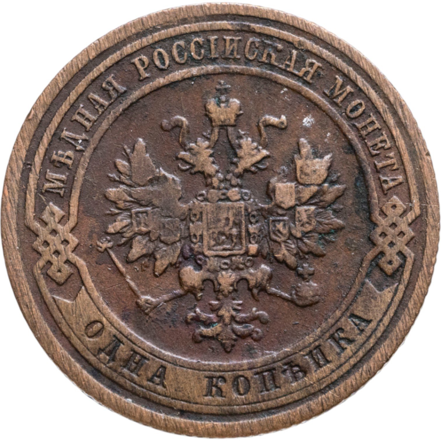 В центре монеты изображен Малый Государственный Герб Российской империи - двуглавый орел, головы которого увенчаны двумя коронами, третья, большая корона над ними. Все они соединены лентой Андрея Первозванного. В правой лапе орла – скипетр, в левой – держава. На его груди расположен Московский герб, в щите изображен Георгий Победоносец с копьем поражающий дракона. Вокруг щита цепь ордена Св. Апостола Андрея Первозванного. На крыльях орла изображены гербы: Царства Казанского, Польского, Херсонеса Таврического, Астраханского, Сибирского, Грузинского и герб соединенных княжеств Киевского, Новгородского и Владимирского — по 4 на каждое крыло. По окружности - две полукруглые плашки, соединенные узорами. На верхней плашке выпуклая надпись: "МЕДНАЯ РОССИЙСКАЯ МОНЕТА". На нижней плашке, изображенной в виде ленты, углубленная надпись: "ОДНА КОПЕЙКА".