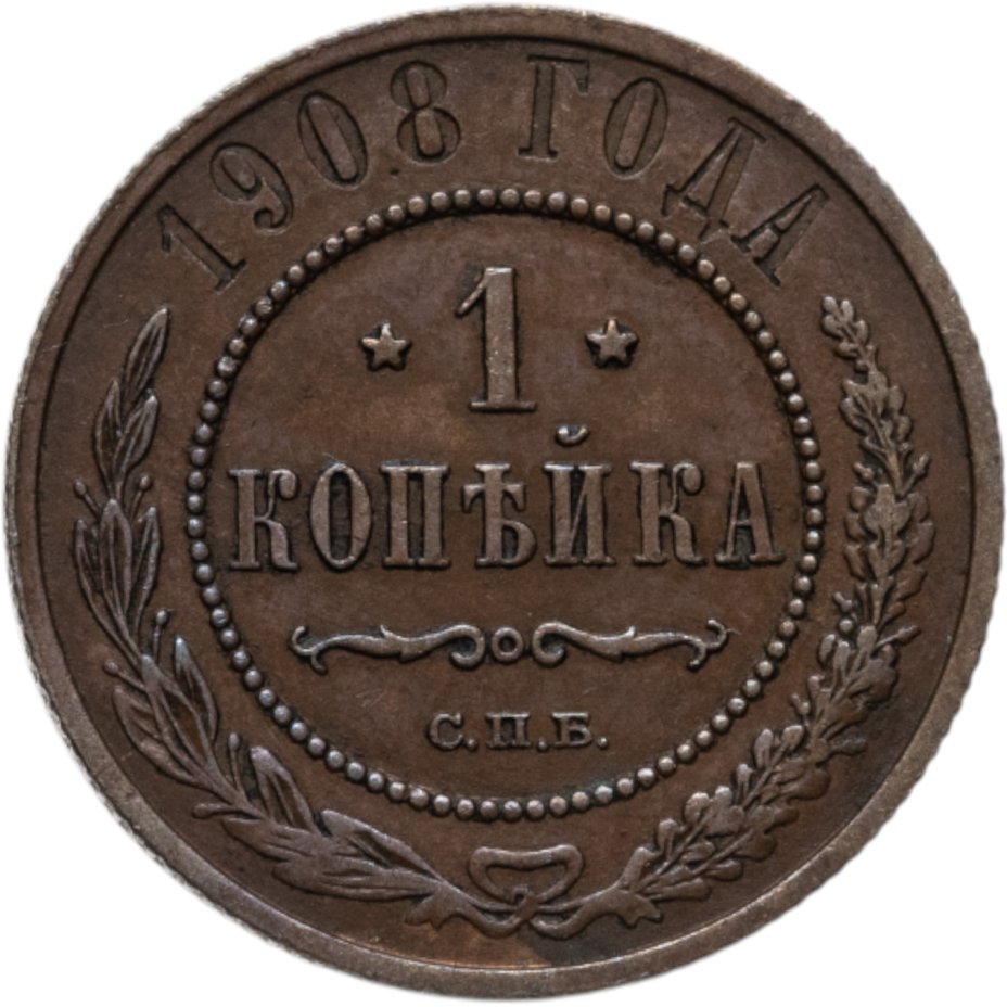 В центре указан номинал — цифра «1», ограниченная с обеих сторон звездочками. Под цифрой номинала — слово "КОПЕЙКА". Ниже, расположен декоративный разделитель в виде двух изогнутых линий и небольшой окружности между ними. Под разделителем — обозначение монетного двора «С.П.Б.». Центральная часть отделена от остального изображения, окружностью в виде точек. В верхней части полукругом углубленная надпись: "1908 ГОДА". Ниже этой надписи, вдоль канта, изображен венок из лавровой и дубовой ветвей, которые, в нижней части, перевязаны лентой на узел бантом.
