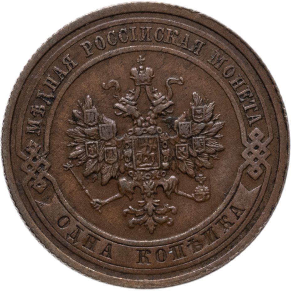 В центре монеты изображен Малый Государственный Герб Российской империи - двуглавый орел, головы которого увенчаны двумя коронами, третья, большая корона над ними. Все они соединены лентой Андрея Первозванного. В правой лапе орла – скипетр, в левой – держава. На его груди расположен Московский герб, в щите изображен Георгий Победоносец с копьем поражающий дракона. Вокруг щита цепь ордена Св. Апостола Андрея Первозванного. На крыльях орла изображены гербы: Царства Казанского, Польского, Херсонеса Таврического, Астраханского, Сибирского, Грузинского и герб соединенных княжеств Киевского, Новгородского и Владимирского — по 4 на каждое крыло. По окружности - две полукруглые плашки, соединенные узорами. На верхней плашке выпуклая надпись: "МЕДНАЯ РОССИЙСКАЯ МОНЕТА". На нижней плашке, изображенной в виде ленты, углубленная надпись: "ОДНА КОПЕЙКА".