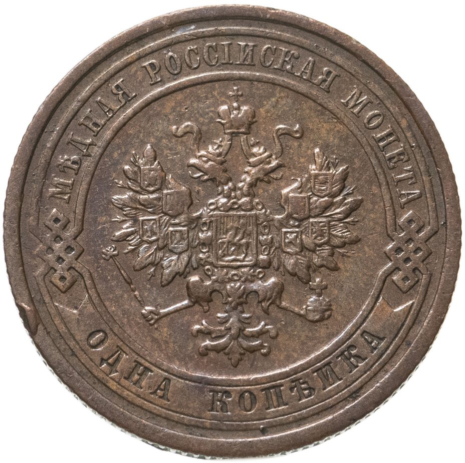 В центре монеты изображен Малый Государственный Герб Российской империи - двуглавый орел, головы которого увенчаны двумя коронами, третья, большая корона над ними. Все они соединены лентой Андрея Первозванного. В правой лапе орла – скипетр, в левой – держава. На его груди расположен Московский герб, в щите изображен Георгий Победоносец с копьем поражающий дракона. Вокруг щита цепь ордена Св. Апостола Андрея Первозванного. На крыльях орла изображены гербы: Царства Казанского, Польского, Херсонеса Таврического, Астраханского, Сибирского, Грузинского и герб соединенных княжеств Киевского, Новгородского и Владимирского — по 4 на каждое крыло. По окружности - две полукруглые плашки, соединенные узорами. На верхней плашке выпуклая надпись: "МЕДНАЯ РОССИЙСКАЯ МОНЕТА". На нижней плашке, изображенной в виде ленты, углубленная надпись: "ОДНА КОПЕЙКА".