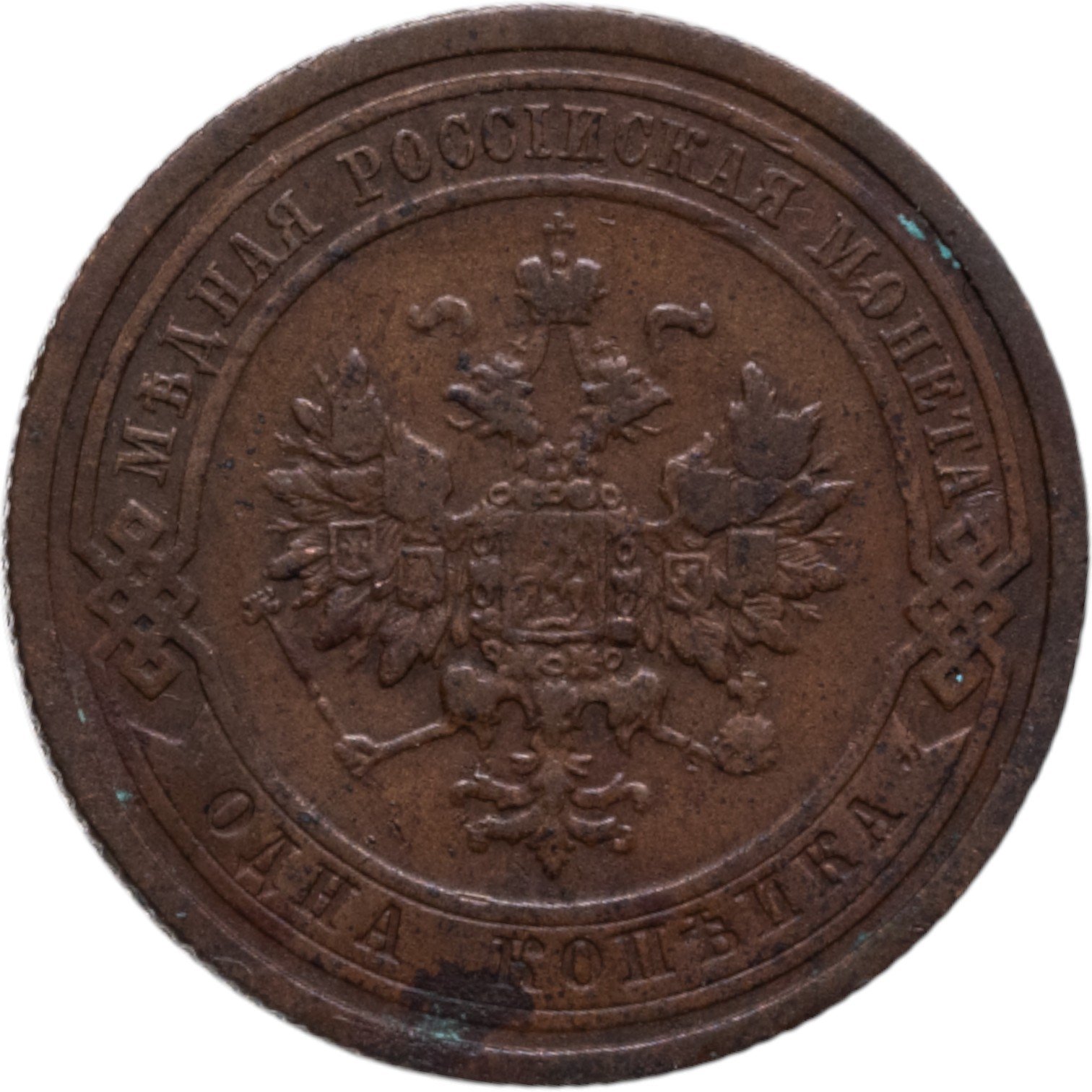 В центре монеты изображен Малый Государственный Герб Российской империи - двуглавый орел, головы которого увенчаны двумя коронами, третья, большая корона над ними. Все они соединены лентой Андрея Первозванного. В правой лапе орла – скипетр, в левой – держава. На его груди расположен Московский герб, в щите изображен Георгий Победоносец с копьем поражающий дракона. Вокруг щита цепь ордена Св. Апостола Андрея Первозванного. На крыльях орла изображены гербы: Царства Казанского, Польского, Херсонеса Таврического, Астраханского, Сибирского, Грузинского и герб соединенных княжеств Киевского, Новгородского и Владимирского — по 4 на каждое крыло. По окружности - две полукруглые плашки, соединенные узорами. На верхней плашке выпуклая надпись: "МЕДНАЯ РОССИЙСКАЯ МОНЕТА". На нижней плашке, изображенной в виде ленты, углубленная надпись: "ОДНА КОПЕЙКА".