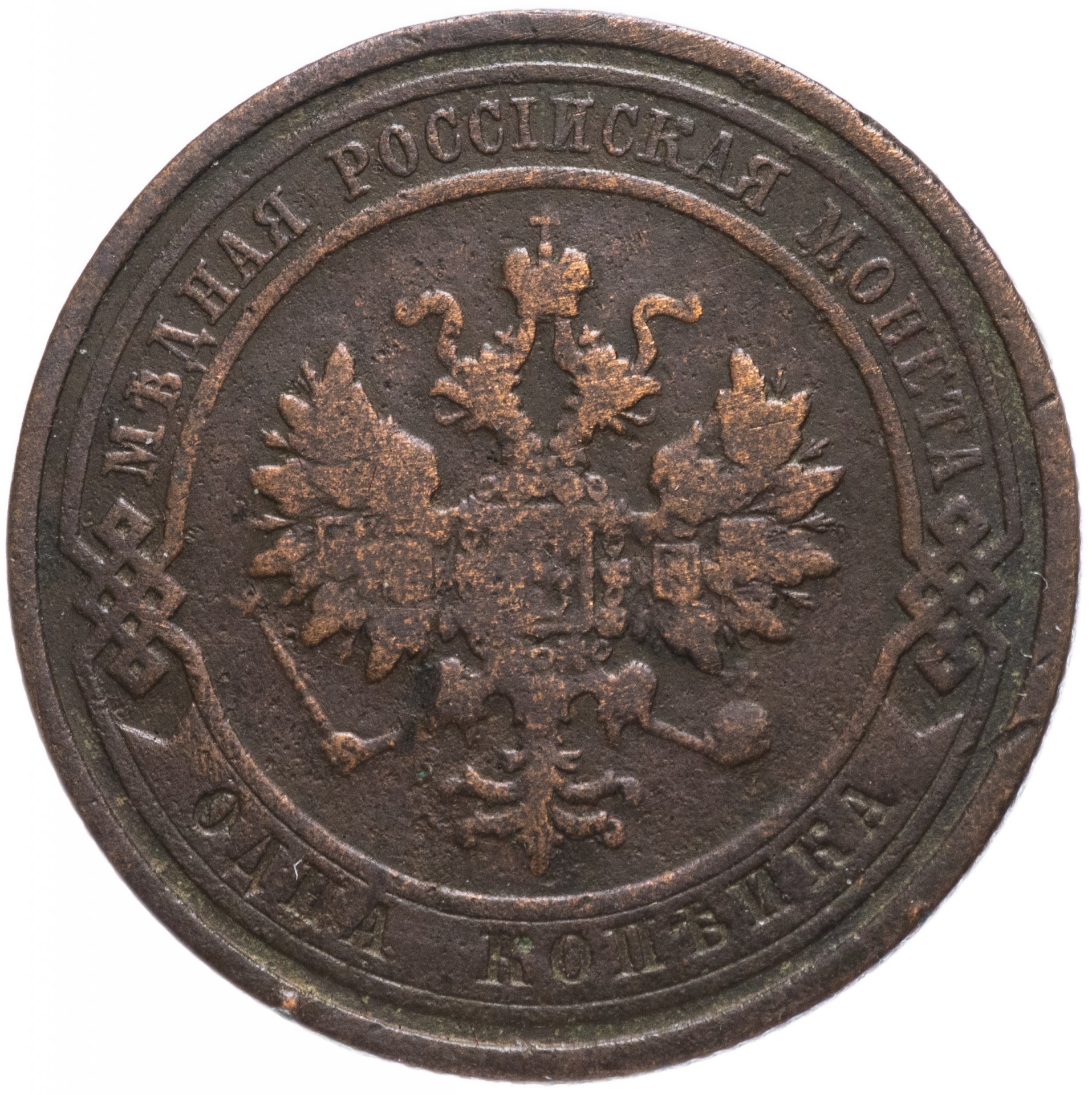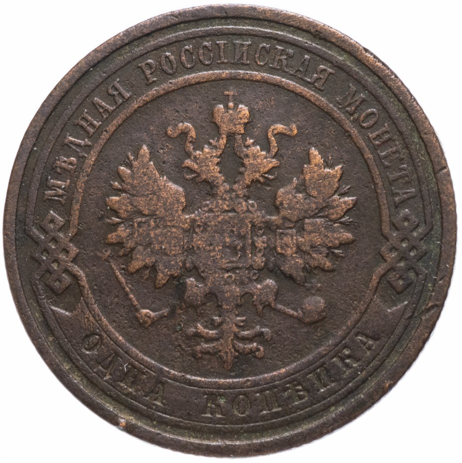 В центре монеты изображен Малый Государственный Герб Российской империи - двуглавый орел, головы которого увенчаны двумя коронами, третья, большая корона над ними. Все они соединены лентой Андрея Первозванного. В правой лапе орла – скипетр, в левой – держава. На его груди расположен Московский герб, в щите изображен Георгий Победоносец с копьем поражающий дракона. Вокруг щита цепь ордена Св. Апостола Андрея Первозванного. На крыльях орла изображены гербы: Царства Казанского, Польского, Херсонеса Таврического, Астраханского, Сибирского, Грузинского и герб соединенных княжеств Киевского, Новгородского и Владимирского — по 4 на каждое крыло. По окружности - две полукруглые плашки, соединенные узорами. На верхней плашке выпуклая надпись: "МЕДНАЯ РОССИЙСКАЯ МОНЕТА". На нижней плашке, изображенной в виде ленты, углубленная надпись: "ОДНА КОПЕЙКА".