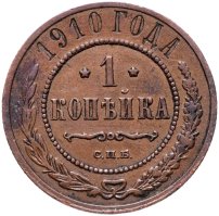 В центре указан номинал — цифра «1», ограниченная с обеих сторон звездочками. Под цифрой номинала — слово "КОПЕЙКА". Ниже, расположен декоративный разделитель в виде двух изогнутых линий и небольшой окружности между ними. Под разделителем — обозначение монетного двора «С.П.Б.». Центральная часть отделена от остального изображения, окружностью в виде точек. В верхней части полукругом углубленная надпись: "1910 ГОДА". Ниже этой надписи, вдоль канта, изображен венок из лавровой и дубовой ветвей, которые, в нижней части, перевязаны лентой на узел бантом.