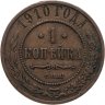 В центре монеты изображен Малый Государственный Герб Российской империи - двуглавый орел, головы которого увенчаны двумя коронами, третья, большая корона над ними. Все они соединены лентой Андрея Первозванного. В правой лапе орла – скипетр, в левой – держава. На его груди расположен Московский герб, в щите изображен Георгий Победоносец с копьем поражающий дракона. Вокруг щита цепь ордена Св. Апостола Андрея Первозванного. На крыльях орла изображены гербы: Царства Казанского, Польского, Херсонеса Таврического, Астраханского, Сибирского, Грузинского и герб соединенных княжеств Киевского, Новгородского и Владимирского — по 4 на каждое крыло. По окружности - две полукруглые плашки, соединенные узорами. На верхней плашке выпуклая надпись: "МЕДНАЯ РОССИЙСКАЯ МОНЕТА". На нижней плашке, изображенной в виде ленты, углубленная надпись: "ОДНА КОПЕЙКА".
