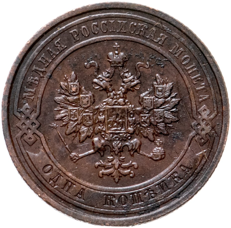 В центре монеты изображен Малый Государственный Герб Российской империи - двуглавый орел, головы которого увенчаны двумя коронами, третья, большая корона над ними. Все они соединены лентой Андрея Первозванного. В правой лапе орла – скипетр, в левой – держава. На его груди расположен Московский герб, в щите изображен Георгий Победоносец с копьем поражающий дракона. Вокруг щита цепь ордена Св. Апостола Андрея Первозванного. На крыльях орла изображены гербы: Царства Казанского, Польского, Херсонеса Таврического, Астраханского, Сибирского, Грузинского и герб соединенных княжеств Киевского, Новгородского и Владимирского — по 4 на каждое крыло. По окружности - две полукруглые плашки, соединенные узорами. На верхней плашке выпуклая надпись: "МЕДНАЯ РОССИЙСКАЯ МОНЕТА". На нижней плашке, изображенной в виде ленты, углубленная надпись: "ОДНА КОПЕЙКА".