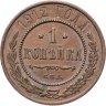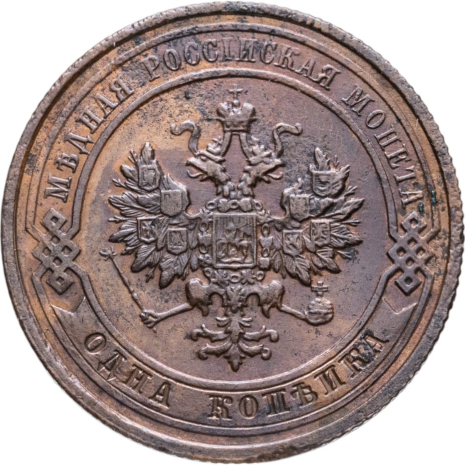 В центре монеты изображен Малый Государственный Герб Российской империи - двуглавый орел, головы которого увенчаны двумя коронами, третья, большая корона над ними. Все они соединены лентой Андрея Первозванного. В правой лапе орла – скипетр, в левой – держава. На его груди расположен Московский герб, в щите изображен Георгий Победоносец с копьем поражающий дракона. Вокруг щита цепь ордена Св. Апостола Андрея Первозванного. На крыльях орла изображены гербы: Царства Казанского, Польского, Херсонеса Таврического, Астраханского, Сибирского, Грузинского и герб соединенных княжеств Киевского, Новгородского и Владимирского — по 4 на каждое крыло. По окружности - две полукруглые плашки, соединенные узорами. На верхней плашке выпуклая надпись: "МЕДНАЯ РОССИЙСКАЯ МОНЕТА". На нижней плашке, изображенной в виде ленты, углубленная надпись: "ОДНА КОПЕЙКА".