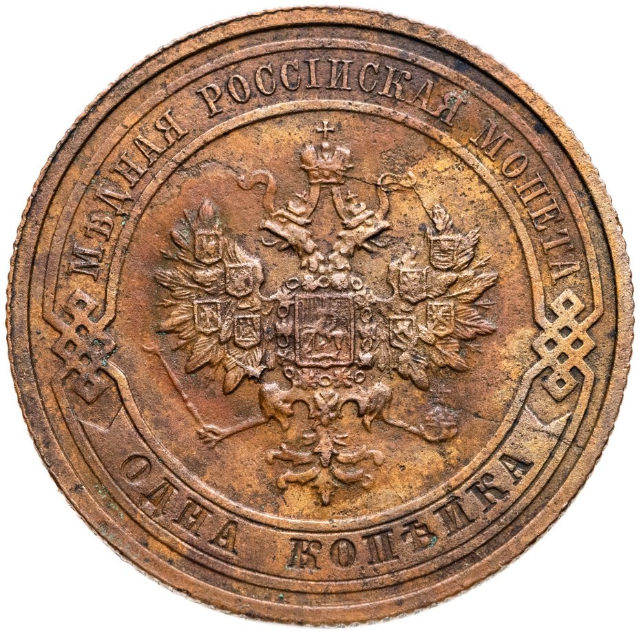В центре монеты изображен Малый Государственный Герб Российской империи - двуглавый орел, головы которого увенчаны двумя коронами, третья, большая корона над ними. Все они соединены лентой Андрея Первозванного. В правой лапе орла – скипетр, в левой – держава. На его груди расположен Московский герб, в щите изображен Георгий Победоносец с копьем поражающий дракона. Вокруг щита цепь ордена Св. Апостола Андрея Первозванного. На крыльях орла изображены гербы: Царства Казанского, Польского, Херсонеса Таврического, Астраханского, Сибирского, Грузинского и герб соединенных княжеств Киевского, Новгородского и Владимирского — по 4 на каждое крыло. По окружности - две полукруглые плашки, соединенные узорами. На верхней плашке выпуклая надпись: "МЕДНАЯ РОССИЙСКАЯ МОНЕТА". На нижней плашке, изображенной в виде ленты, углубленная надпись: "ОДНА КОПЕЙКА".