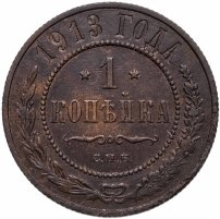 В центре указан номинал — цифра «1», ограниченная с обеих сторон звездочками. Под цифрой номинала — слово "КОПЕЙКА". Ниже, расположен декоративный разделитель в виде двух изогнутых линий и небольшой окружности между ними. Под разделителем — обозначение монетного двора «С.П.Б.». Центральная часть отделена от остального изображения, окружностью в виде точек. В верхней части полукругом углубленная надпись: "1913 ГОДА". Ниже этой надписи, вдоль канта, изображен венок из лавровой и дубовой ветвей, которые, в нижней части, перевязаны лентой на узел бантом.