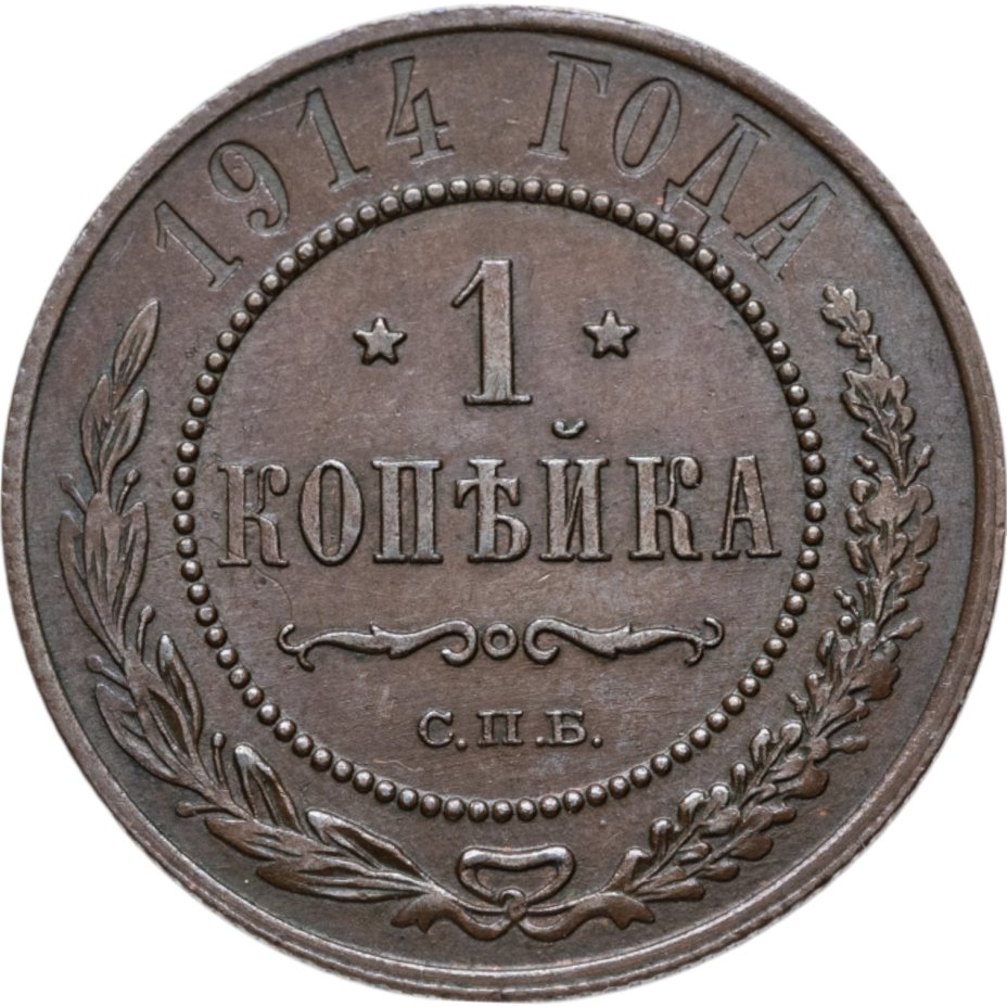 В центре указан номинал — цифра «1», ограниченная с обеих сторон звездочками. Под цифрой номинала — слово "КОПЕЙКА". Ниже, расположен декоративный разделитель в виде двух изогнутых линий и небольшой окружности между ними. Под разделителем — обозначение монетного двора «С.П.Б.». Центральная часть отделена от остального изображения, окружностью в виде точек. В верхней части полукругом углубленная надпись: "1914 ГОДА". Ниже этой надписи, вдоль канта, изображен венок из лавровой и дубовой ветвей, которые, в нижней части, перевязаны лентой на узел бантом.