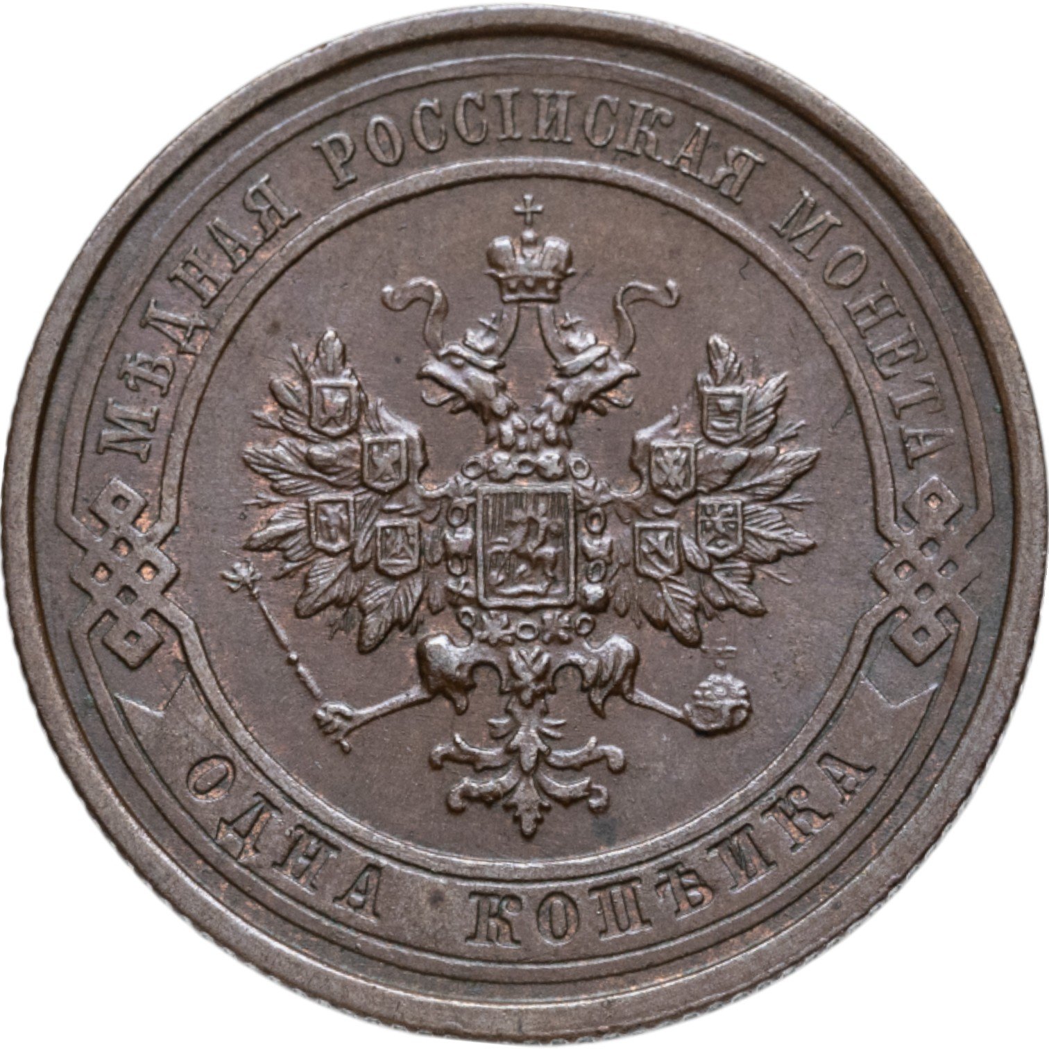 В центре монеты изображен Малый Государственный Герб Российской империи - двуглавый орел, головы которого увенчаны двумя коронами, третья, большая корона над ними. Все они соединены лентой Андрея Первозванного. В правой лапе орла – скипетр, в левой – держава. На его груди расположен Московский герб, в щите изображен Георгий Победоносец с копьем поражающий дракона. Вокруг щита цепь ордена Св. Апостола Андрея Первозванного. На крыльях орла изображены гербы: Царства Казанского, Польского, Херсонеса Таврического, Астраханского, Сибирского, Грузинского и герб соединенных княжеств Киевского, Новгородского и Владимирского — по 4 на каждое крыло. По окружности - две полукруглые плашки, соединенные узорами. На верхней плашке выпуклая надпись: "МЕДНАЯ РОССИЙСКАЯ МОНЕТА". На нижней плашке, изображенной в виде ленты, углубленная надпись: "ОДНА КОПЕЙКА".