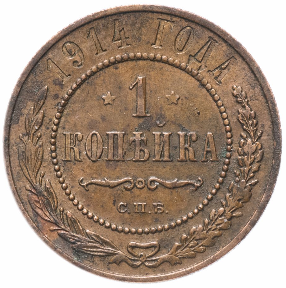 В центре указан номинал — цифра «1», ограниченная с обеих сторон звездочками. Под цифрой номинала — слово "КОПЕЙКА". Ниже, расположен декоративный разделитель в виде двух изогнутых линий и небольшой окружности между ними. Под разделителем — обозначение монетного двора «С.П.Б.». Центральная часть отделена от остального изображения, окружностью в виде точек. В верхней части полукругом углубленная надпись: "1914 ГОДА". Ниже этой надписи, вдоль канта, изображен венок из лавровой и дубовой ветвей, которые, в нижней части, перевязаны лентой на узел бантом.