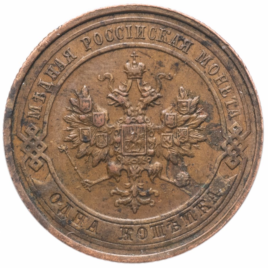 В центре монеты изображен Малый Государственный Герб Российской империи - двуглавый орел, головы которого увенчаны двумя коронами, третья, большая корона над ними. Все они соединены лентой Андрея Первозванного. В правой лапе орла – скипетр, в левой – держава. На его груди расположен Московский герб, в щите изображен Георгий Победоносец с копьем поражающий дракона. Вокруг щита цепь ордена Св. Апостола Андрея Первозванного. На крыльях орла изображены гербы: Царства Казанского, Польского, Херсонеса Таврического, Астраханского, Сибирского, Грузинского и герб соединенных княжеств Киевского, Новгородского и Владимирского — по 4 на каждое крыло. По окружности - две полукруглые плашки, соединенные узорами. На верхней плашке выпуклая надпись: "МЕДНАЯ РОССИЙСКАЯ МОНЕТА". На нижней плашке, изображенной в виде ленты, углубленная надпись: "ОДНА КОПЕЙКА".