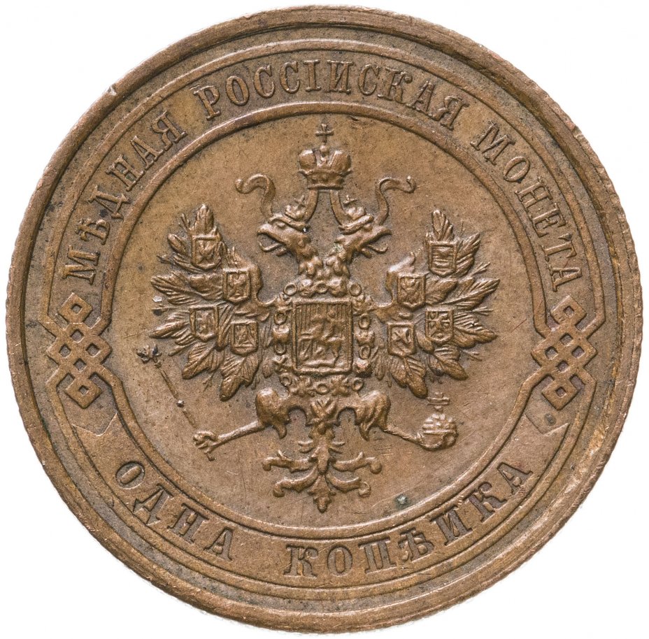 В центре монеты изображен Малый Государственный Герб Российской империи - двуглавый орел, головы которого увенчаны двумя коронами, третья, большая корона над ними. Все они соединены лентой Андрея Первозванного. В правой лапе орла – скипетр, в левой – держава. На его груди расположен Московский герб, в щите изображен Георгий Победоносец с копьем поражающий дракона. Вокруг щита цепь ордена Св. Апостола Андрея Первозванного. На крыльях орла изображены гербы: Царства Казанского, Польского, Херсонеса Таврического, Астраханского, Сибирского, Грузинского и герб соединенных княжеств Киевского, Новгородского и Владимирского — по 4 на каждое крыло. По окружности - две полукруглые плашки, соединенные узорами. На верхней плашке выпуклая надпись: "МЕДНАЯ РОССИЙСКАЯ МОНЕТА". На нижней плашке, изображенной в виде ленты, углубленная надпись: "ОДНА КОПЕЙКА".
