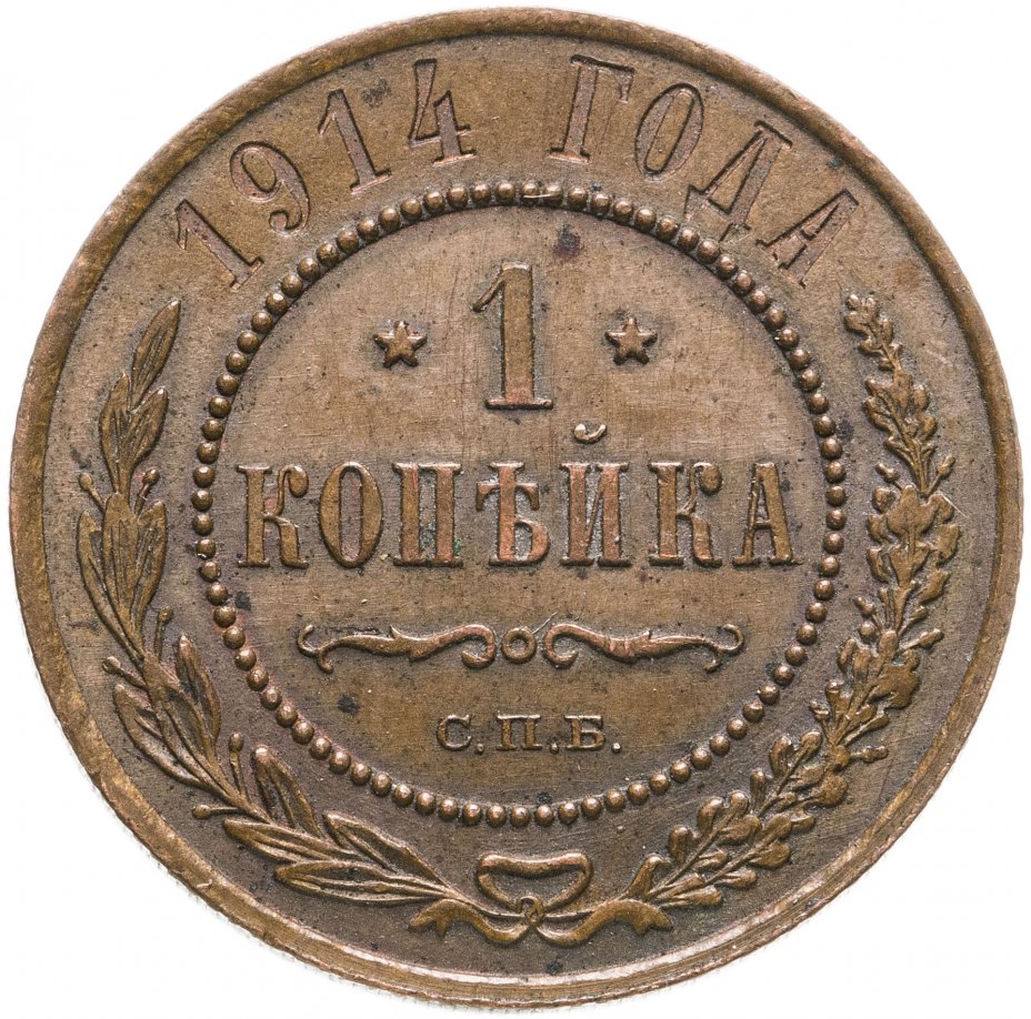 В центре указан номинал — цифра «1», ограниченная с обеих сторон звездочками. Под цифрой номинала — слово "КОПЕЙКА". Ниже, расположен декоративный разделитель в виде двух изогнутых линий и небольшой окружности между ними. Под разделителем — обозначение монетного двора «С.П.Б.». Центральная часть отделена от остального изображения, окружностью в виде точек. В верхней части полукругом углубленная надпись: "1914 ГОДА". Ниже этой надписи, вдоль канта, изображен венок из лавровой и дубовой ветвей, которые, в нижней части, перевязаны лентой на узел бантом.