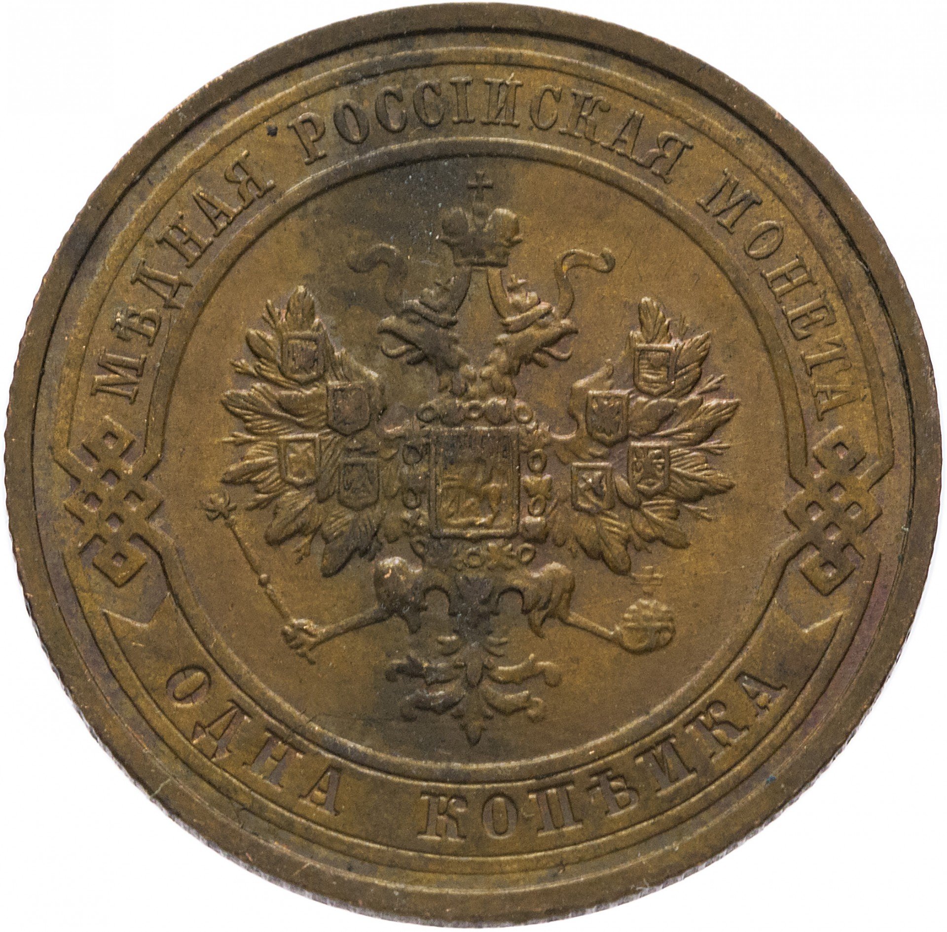 В центре монеты изображен Малый Государственный Герб Российской империи - двуглавый орел, головы которого увенчаны двумя коронами, третья, большая корона над ними. Все они соединены лентой Андрея Первозванного. В правой лапе орла – скипетр, в левой – держава. На его груди расположен Московский герб, в щите изображен Георгий Победоносец с копьем поражающий дракона. Вокруг щита цепь ордена Св. Апостола Андрея Первозванного. На крыльях орла изображены гербы: Царства Казанского, Польского, Херсонеса Таврического, Астраханского, Сибирского, Грузинского и герб соединенных княжеств Киевского, Новгородского и Владимирского — по 4 на каждое крыло. По окружности - две полукруглые плашки, соединенные узорами. На верхней плашке выпуклая надпись: "МЕДНАЯ РОССИЙСКАЯ МОНЕТА". На нижней плашке, изображенной в виде ленты, углубленная надпись: "ОДНА КОПЕЙКА".
