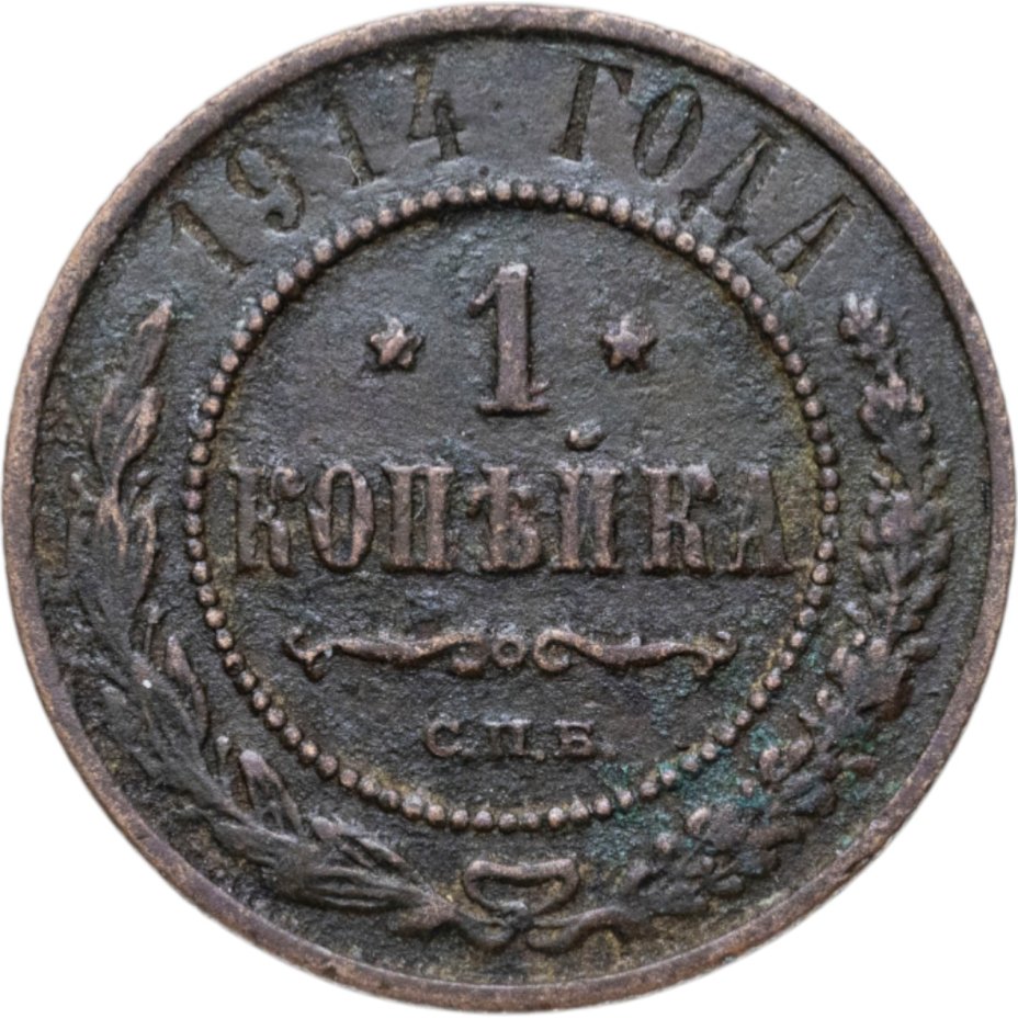 В центре указан номинал — цифра «1», ограниченная с обеих сторон звездочками. Под цифрой номинала — слово "КОПЕЙКА". Ниже, расположен декоративный разделитель в виде двух изогнутых линий и небольшой окружности между ними. Под разделителем — обозначение монетного двора «С.П.Б.». Центральная часть отделена от остального изображения, окружностью в виде точек. В верхней части полукругом углубленная надпись: "1914 ГОДА". Ниже этой надписи, вдоль канта, изображен венок из лавровой и дубовой ветвей, которые, в нижней части, перевязаны лентой на узел бантом.