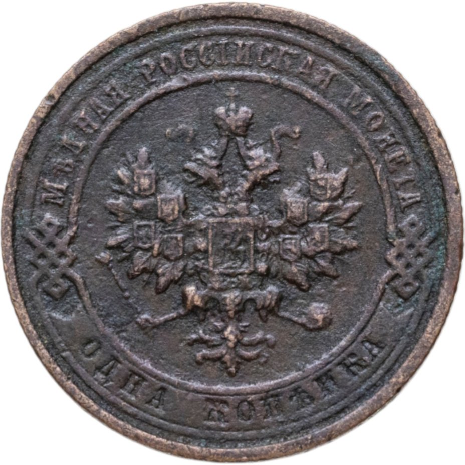В центре монеты изображен Малый Государственный Герб Российской империи - двуглавый орел, головы которого увенчаны двумя коронами, третья, большая корона над ними. Все они соединены лентой Андрея Первозванного. В правой лапе орла – скипетр, в левой – держава. На его груди расположен Московский герб, в щите изображен Георгий Победоносец с копьем поражающий дракона. Вокруг щита цепь ордена Св. Апостола Андрея Первозванного. На крыльях орла изображены гербы: Царства Казанского, Польского, Херсонеса Таврического, Астраханского, Сибирского, Грузинского и герб соединенных княжеств Киевского, Новгородского и Владимирского — по 4 на каждое крыло. По окружности - две полукруглые плашки, соединенные узорами. На верхней плашке выпуклая надпись: "МЕДНАЯ РОССИЙСКАЯ МОНЕТА". На нижней плашке, изображенной в виде ленты, углубленная надпись: "ОДНА КОПЕЙКА".