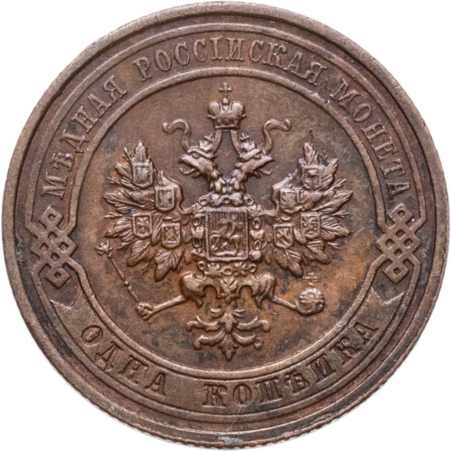 В центре монеты изображен Малый Государственный Герб Российской империи - двуглавый орел, головы которого увенчаны двумя коронами, третья, большая корона над ними. Все они соединены лентой Андрея Первозванного. В правой лапе орла – скипетр, в левой – держава. На его груди расположен Московский герб, в щите изображен Георгий Победоносец с копьем поражающий дракона. Вокруг щита цепь ордена Св. Апостола Андрея Первозванного. На крыльях орла изображены гербы: Царства Казанского, Польского, Херсонеса Таврического, Астраханского, Сибирского, Грузинского и герб соединенных княжеств Киевского, Новгородского и Владимирского — по 4 на каждое крыло. По окружности - две полукруглые плашки, соединенные узорами. На верхней плашке выпуклая надпись: "МЕДНАЯ РОССИЙСКАЯ МОНЕТА". На нижней плашке, изображенной в виде ленты, углубленная надпись: "ОДНА КОПЕЙКА".