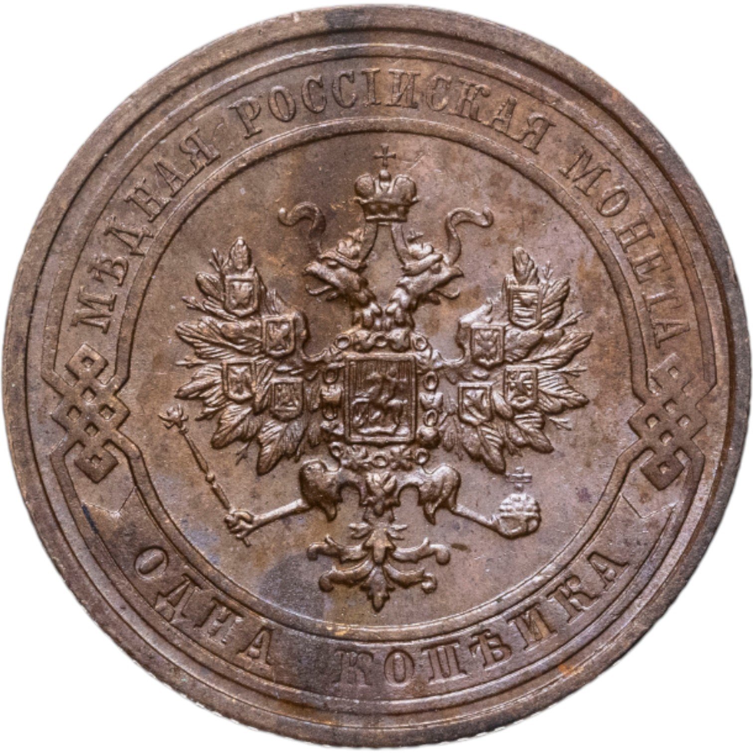 В центре монеты изображен Малый Государственный Герб Российской империи - двуглавый орел, головы которого увенчаны двумя коронами, третья, большая корона над ними. Все они соединены лентой Андрея Первозванного. В правой лапе орла – скипетр, в левой – держава. На его груди расположен Московский герб, в щите изображен Георгий Победоносец с копьем поражающий дракона. Вокруг щита цепь ордена Св. Апостола Андрея Первозванного. На крыльях орла изображены гербы: Царства Казанского, Польского, Херсонеса Таврического, Астраханского, Сибирского, Грузинского и герб соединенных княжеств Киевского, Новгородского и Владимирского — по 4 на каждое крыло. По окружности - две полукруглые плашки, соединенные узорами. На верхней плашке выпуклая надпись: "МЕДНАЯ РОССИЙСКАЯ МОНЕТА". На нижней плашке, изображенной в виде ленты, углубленная надпись: "ОДНА КОПЕЙКА".