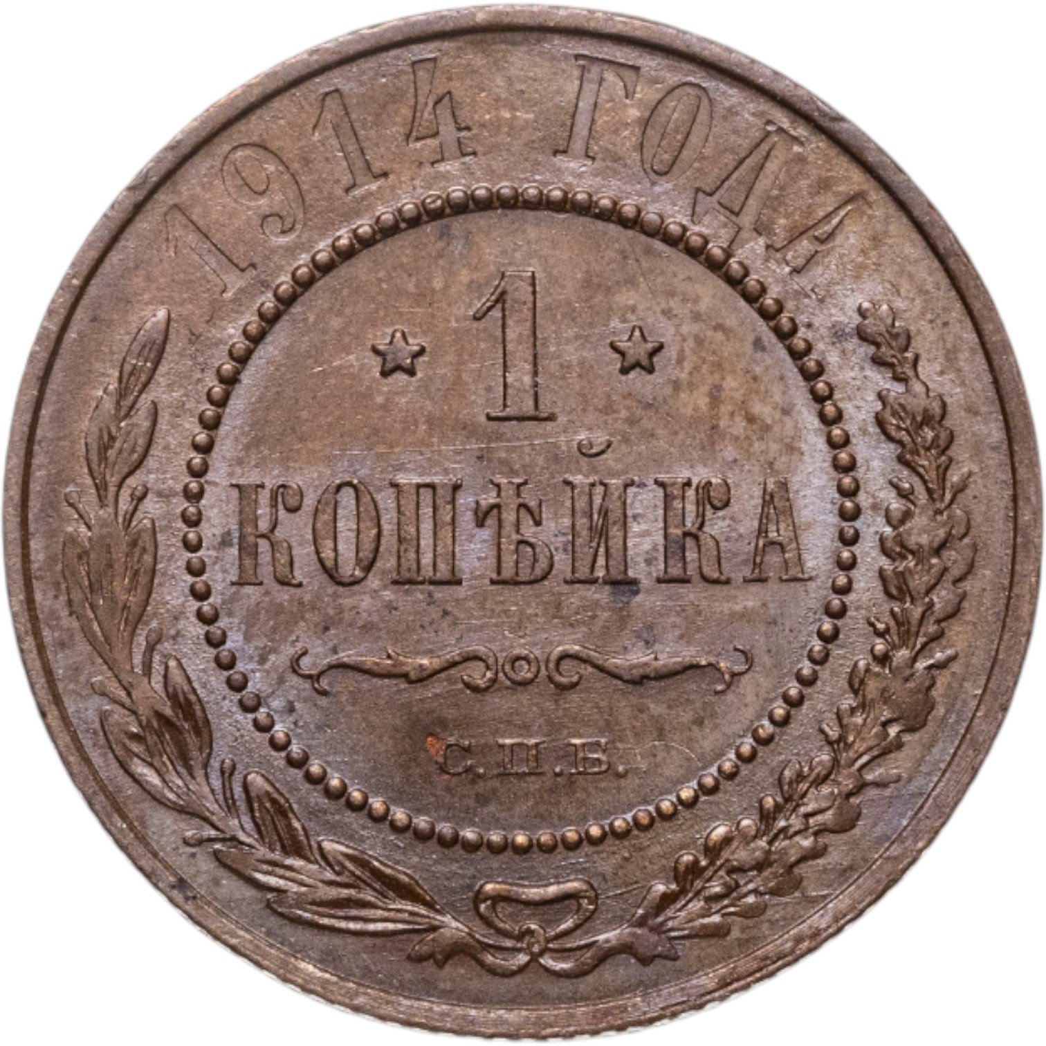 В центре указан номинал — цифра «1», ограниченная с обеих сторон звездочками. Под цифрой номинала — слово "КОПЕЙКА". Ниже, расположен декоративный разделитель в виде двух изогнутых линий и небольшой окружности между ними. Под разделителем — обозначение монетного двора «С.П.Б.». Центральная часть отделена от остального изображения, окружностью в виде точек. В верхней части полукругом углубленная надпись: "1914 ГОДА". Ниже этой надписи, вдоль канта, изображен венок из лавровой и дубовой ветвей, которые, в нижней части, перевязаны лентой на узел бантом.