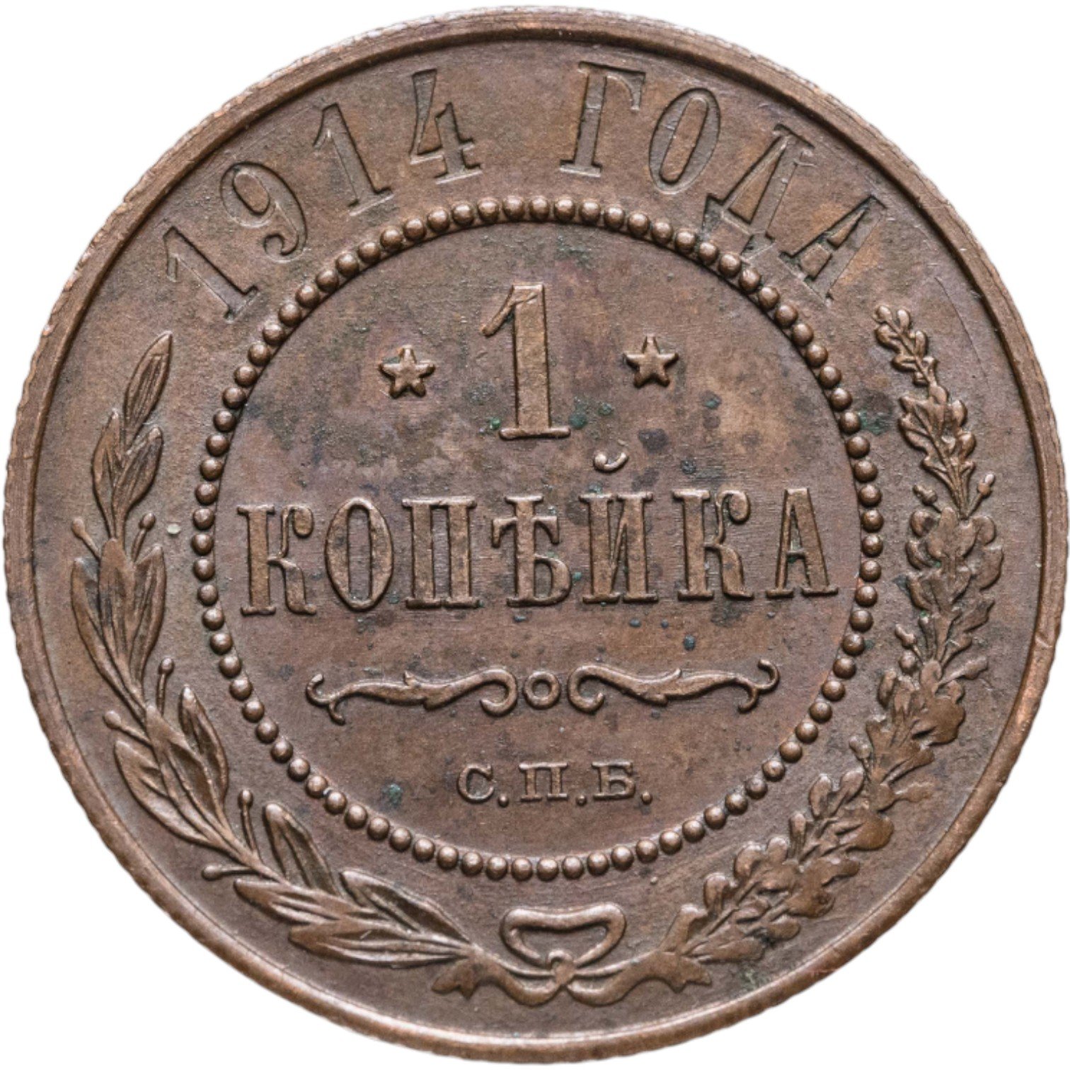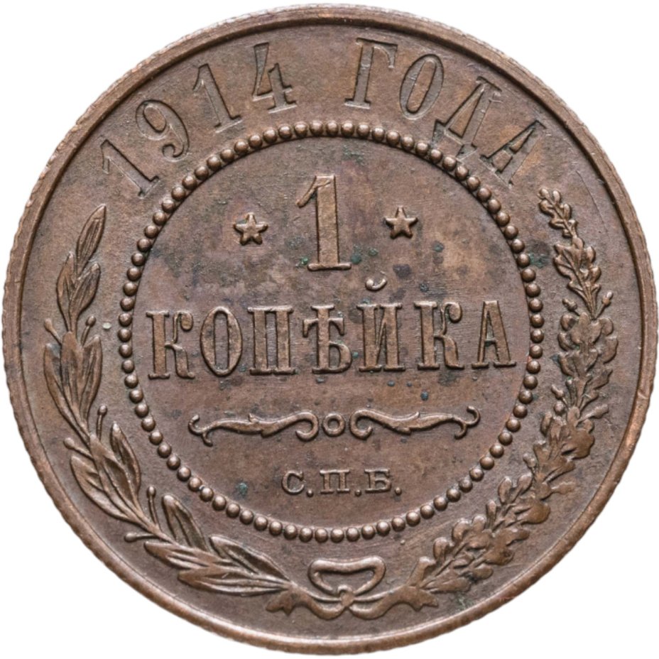 В центре указан номинал — цифра «1», ограниченная с обеих сторон звездочками. Под цифрой номинала — слово "КОПЕЙКА". Ниже, расположен декоративный разделитель в виде двух изогнутых линий и небольшой окружности между ними. Под разделителем — обозначение монетного двора «С.П.Б.». Центральная часть отделена от остального изображения, окружностью в виде точек. В верхней части полукругом углубленная надпись: "1914 ГОДА". Ниже этой надписи, вдоль канта, изображен венок из лавровой и дубовой ветвей, которые, в нижней части, перевязаны лентой на узел бантом.