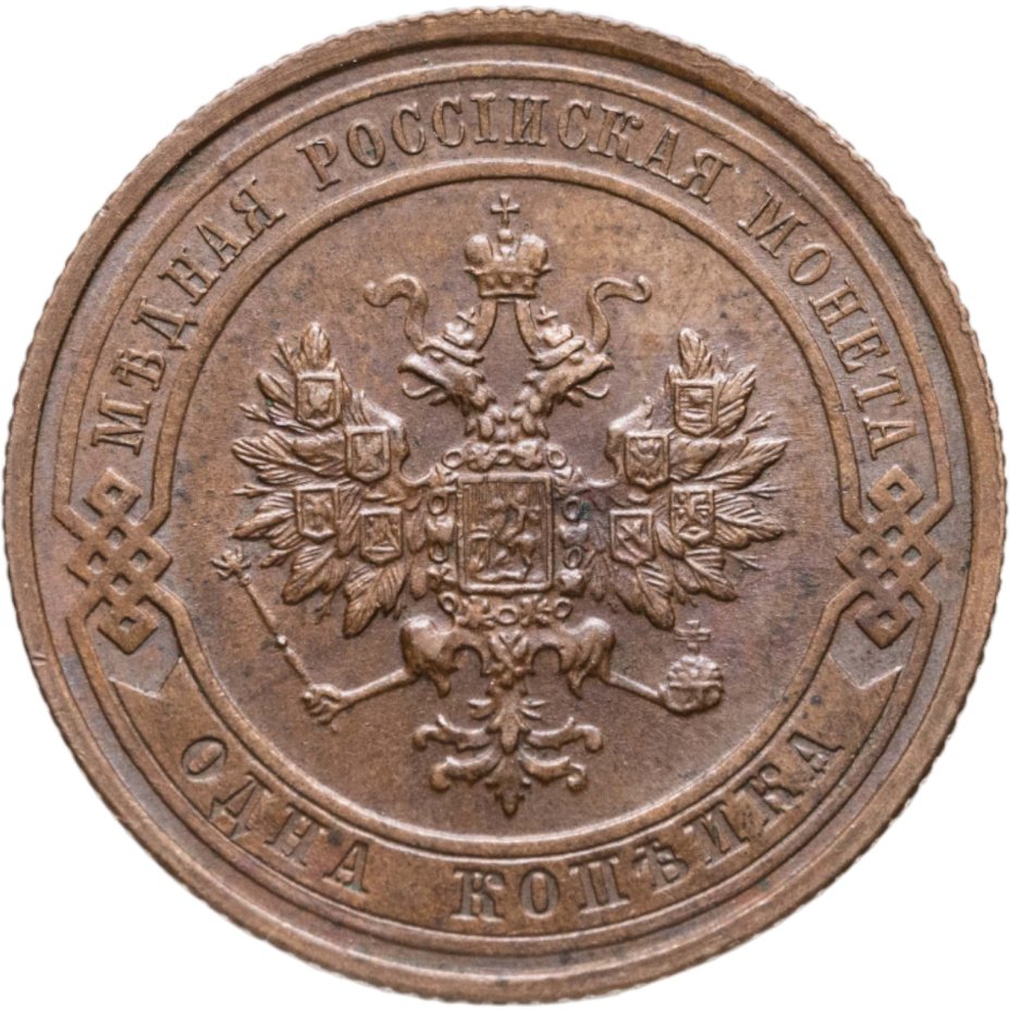 В центре монеты изображен Малый Государственный Герб Российской империи - двуглавый орел, головы которого увенчаны двумя коронами, третья, большая корона над ними. Все они соединены лентой Андрея Первозванного. В правой лапе орла – скипетр, в левой – держава. На его груди расположен Московский герб, в щите изображен Георгий Победоносец с копьем поражающий дракона. Вокруг щита цепь ордена Св. Апостола Андрея Первозванного. На крыльях орла изображены гербы: Царства Казанского, Польского, Херсонеса Таврического, Астраханского, Сибирского, Грузинского и герб соединенных княжеств Киевского, Новгородского и Владимирского — по 4 на каждое крыло. По окружности - две полукруглые плашки, соединенные узорами. На верхней плашке выпуклая надпись: "МЕДНАЯ РОССИЙСКАЯ МОНЕТА". На нижней плашке, изображенной в виде ленты, углубленная надпись: "ОДНА КОПЕЙКА".