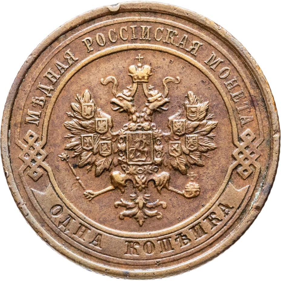 В центре монеты изображен Малый Государственный Герб Российской империи - двуглавый орел, головы которого увенчаны двумя коронами, третья, большая корона над ними. Все они соединены лентой Андрея Первозванного. В правой лапе орла – скипетр, в левой – держава. На его груди расположен Московский герб, в щите изображен Георгий Победоносец с копьем поражающий дракона. Вокруг щита цепь ордена Св. Апостола Андрея Первозванного. На крыльях орла изображены гербы: Царства Казанского, Польского, Херсонеса Таврического, Астраханского, Сибирского, Грузинского и герб соединенных княжеств Киевского, Новгородского и Владимирского — по 4 на каждое крыло. По окружности - две полукруглые плашки, соединенные узорами. На верхней плашке выпуклая надпись: "МЕДНАЯ РОССИЙСКАЯ МОНЕТА". На нижней плашке, изображенной в виде ленты, углубленная надпись: "ОДНА КОПЕЙКА".