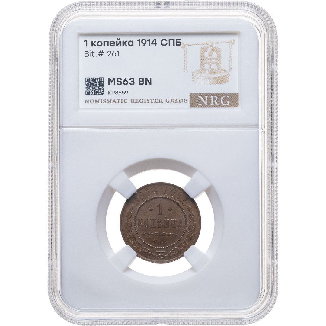 1 копейка 1914 СПБ, в слабе NRG MS63 BN