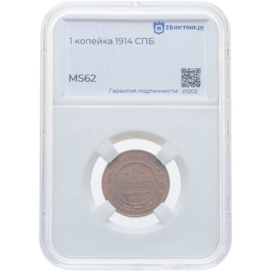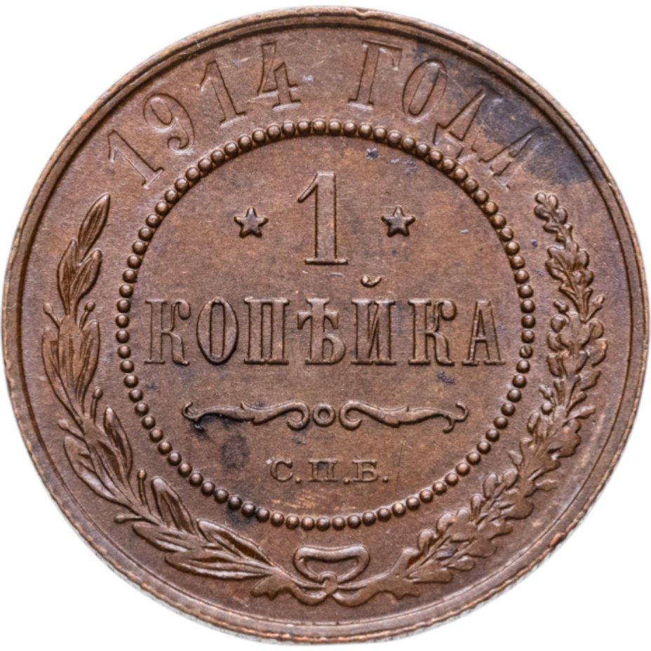 В центре указан номинал — цифра «1», ограниченная с обеих сторон звездочками. Под цифрой номинала — слово "КОПЕЙКА". Ниже, расположен декоративный разделитель в виде двух изогнутых линий и небольшой окружности между ними. Под разделителем — обозначение монетного двора «С.П.Б.». Центральная часть отделена от остального изображения, окружностью в виде точек. В верхней части полукругом углубленная надпись: "1914 ГОДА". Ниже этой надписи, вдоль канта, изображен венок из лавровой и дубовой ветвей, которые, в нижней части, перевязаны лентой на узел бантом.