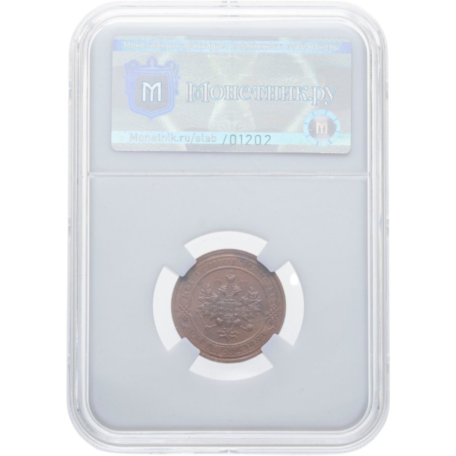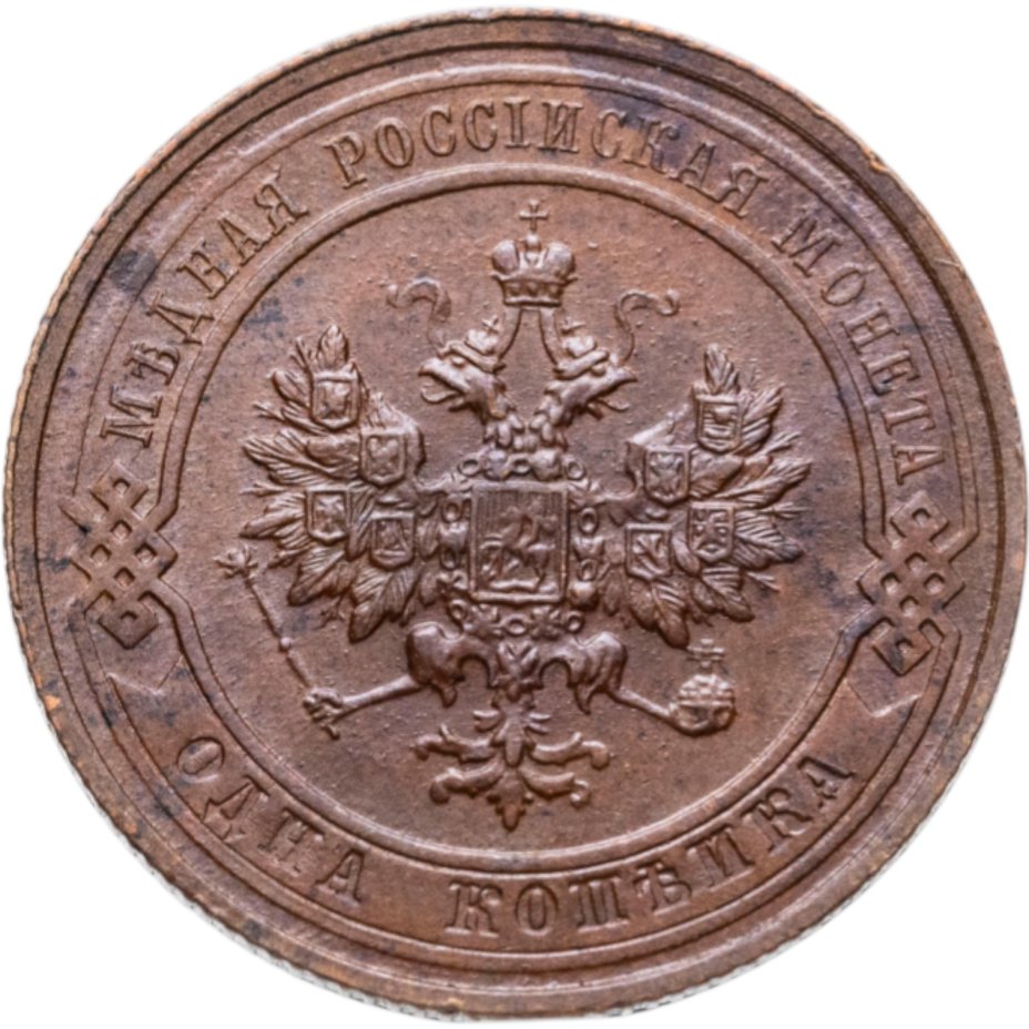 В центре монеты изображен Малый Государственный Герб Российской империи - двуглавый орел, головы которого увенчаны двумя коронами, третья, большая корона над ними. Все они соединены лентой Андрея Первозванного. В правой лапе орла – скипетр, в левой – держава. На его груди расположен Московский герб, в щите изображен Георгий Победоносец с копьем поражающий дракона. Вокруг щита цепь ордена Св. Апостола Андрея Первозванного. На крыльях орла изображены гербы: Царства Казанского, Польского, Херсонеса Таврического, Астраханского, Сибирского, Грузинского и герб соединенных княжеств Киевского, Новгородского и Владимирского — по 4 на каждое крыло. По окружности - две полукруглые плашки, соединенные узорами. На верхней плашке выпуклая надпись: "МЕДНАЯ РОССИЙСКАЯ МОНЕТА". На нижней плашке, изображенной в виде ленты, углубленная надпись: "ОДНА КОПЕЙКА".