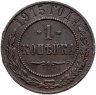 В центре указан номинал — цифра «1», ограниченная с обеих сторон звездочками. Под цифрой номинала — слово "КОПЕЙКА". Ниже, расположен декоративный разделитель в виде двух изогнутых линий и небольшой окружности между ними. Центральная часть отделена от остального изображения, окружностью в виде точек. В верхней части полукругом углубленная надпись: "1915 ГОДА". Ниже этой надписи, вдоль канта, изображен венок из лавровой и дубовой ветвей, которые, в нижней части, перевязаны лентой на узел бантом.