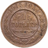 В центре указан номинал — цифра «1», ограниченная с обеих сторон звездочками. Под цифрой номинала — слово "КОПЕЙКА". Ниже, расположен декоративный разделитель в виде двух изогнутых линий и небольшой окружности между ними. Центральная часть отделена от остального изображения, окружностью в виде точек. В верхней части полукругом углубленная надпись: "1915 ГОДА". Ниже этой надписи, вдоль канта, изображен венок из лавровой и дубовой ветвей, которые, в нижней части, перевязаны лентой на узел бантом.