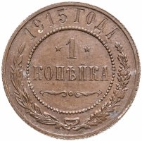 В центре указан номинал — цифра «1», ограниченная с обеих сторон звездочками. Под цифрой номинала — слово "КОПЕЙКА". Ниже, расположен декоративный разделитель в виде двух изогнутых линий и небольшой окружности между ними. Центральная часть отделена от остального изображения, окружностью в виде точек. В верхней части полукругом углубленная надпись: "1915 ГОДА". Ниже этой надписи, вдоль канта, изображен венок из лавровой и дубовой ветвей, которые, в нижней части, перевязаны лентой на узел бантом.