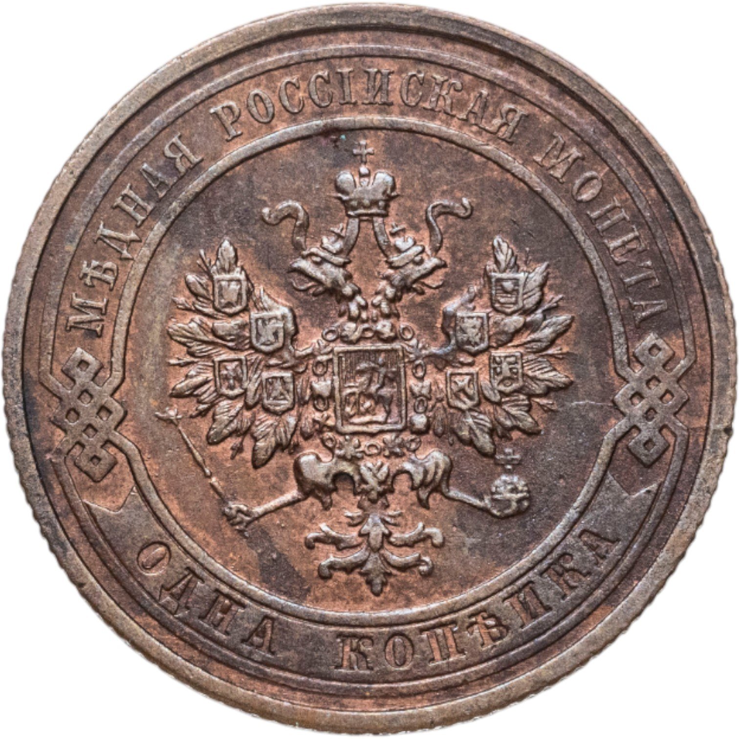 В центре монеты изображен Малый Государственный Герб Российской империи - двуглавый орел, головы которого увенчаны двумя коронами, третья, большая корона над ними. Все они соединены лентой Андрея Первозванного. В правой лапе орла – скипетр, в левой – держава. На его груди расположен Московский герб, в щите изображен Георгий Победоносец с копьем поражающий дракона. Вокруг щита цепь ордена Св. Апостола Андрея Первозванного. На крыльях орла изображены гербы: Царства Казанского, Польского, Херсонеса Таврического, Астраханского, Сибирского, Грузинского и герб соединенных княжеств Киевского, Новгородского и Владимирского — по 4 на каждое крыло. По окружности - две полукруглые плашки, соединенные узорами. На верхней плашке выпуклая надпись: "МЕДНАЯ РОССИЙСКАЯ МОНЕТА". На нижней плашке, изображенной в виде ленты, углубленная надпись: "ОДНА КОПЕЙКА".