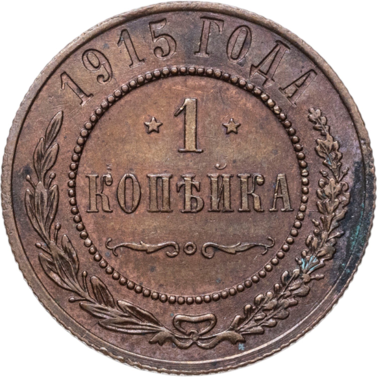 В центре указан номинал — цифра «1», ограниченная с обеих сторон звездочками. Под цифрой номинала — слово "КОПЕЙКА". Ниже, расположен декоративный разделитель в виде двух изогнутых линий и небольшой окружности между ними. Центральная часть отделена от остального изображения, окружностью в виде точек. В верхней части полукругом углубленная надпись: "1915 ГОДА". Ниже этой надписи, вдоль канта, изображен венок из лавровой и дубовой ветвей, которые, в нижней части, перевязаны лентой на узел бантом.