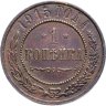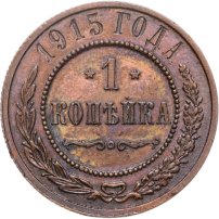 В центре указан номинал — цифра «1», ограниченная с обеих сторон звездочками. Под цифрой номинала — слово "КОПЕЙКА". Ниже, расположен декоративный разделитель в виде двух изогнутых линий и небольшой окружности между ними. Центральная часть отделена от остального изображения, окружностью в виде точек. В верхней части полукругом углубленная надпись: "1915 ГОДА". Ниже этой надписи, вдоль канта, изображен венок из лавровой и дубовой ветвей, которые, в нижней части, перевязаны лентой на узел бантом.