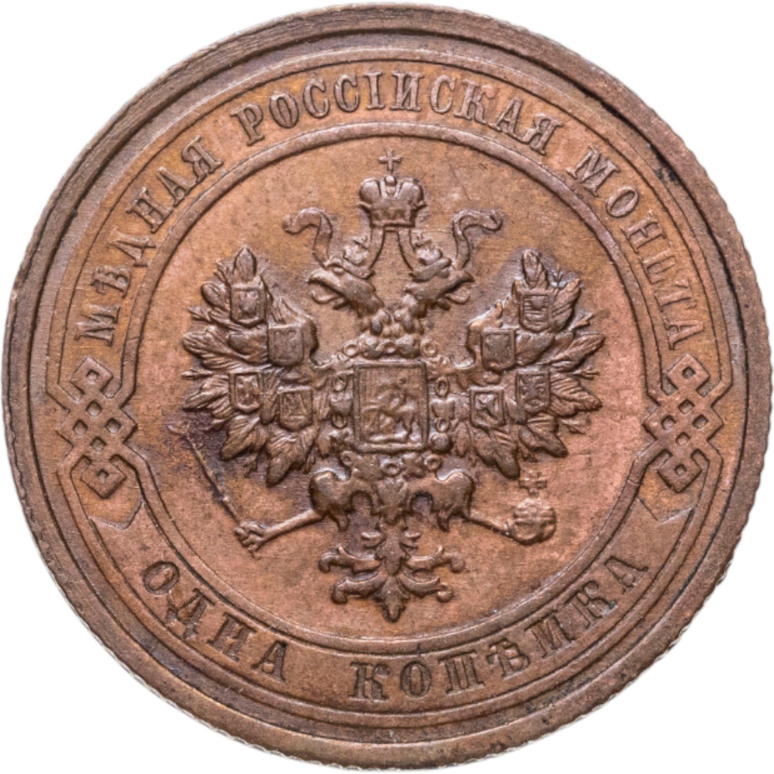 В центре монеты изображен Малый Государственный Герб Российской империи - двуглавый орел, головы которого увенчаны двумя коронами, третья, большая корона над ними. Все они соединены лентой Андрея Первозванного. В правой лапе орла – скипетр, в левой – держава. На его груди расположен Московский герб, в щите изображен Георгий Победоносец с копьем поражающий дракона. Вокруг щита цепь ордена Св. Апостола Андрея Первозванного. На крыльях орла изображены гербы: Царства Казанского, Польского, Херсонеса Таврического, Астраханского, Сибирского, Грузинского и герб соединенных княжеств Киевского, Новгородского и Владимирского — по 4 на каждое крыло. По окружности - две полукруглые плашки, соединенные узорами. На верхней плашке выпуклая надпись: "МЕДНАЯ РОССИЙСКАЯ МОНЕТА". На нижней плашке, изображенной в виде ленты, углубленная надпись: "ОДНА КОПЕЙКА".