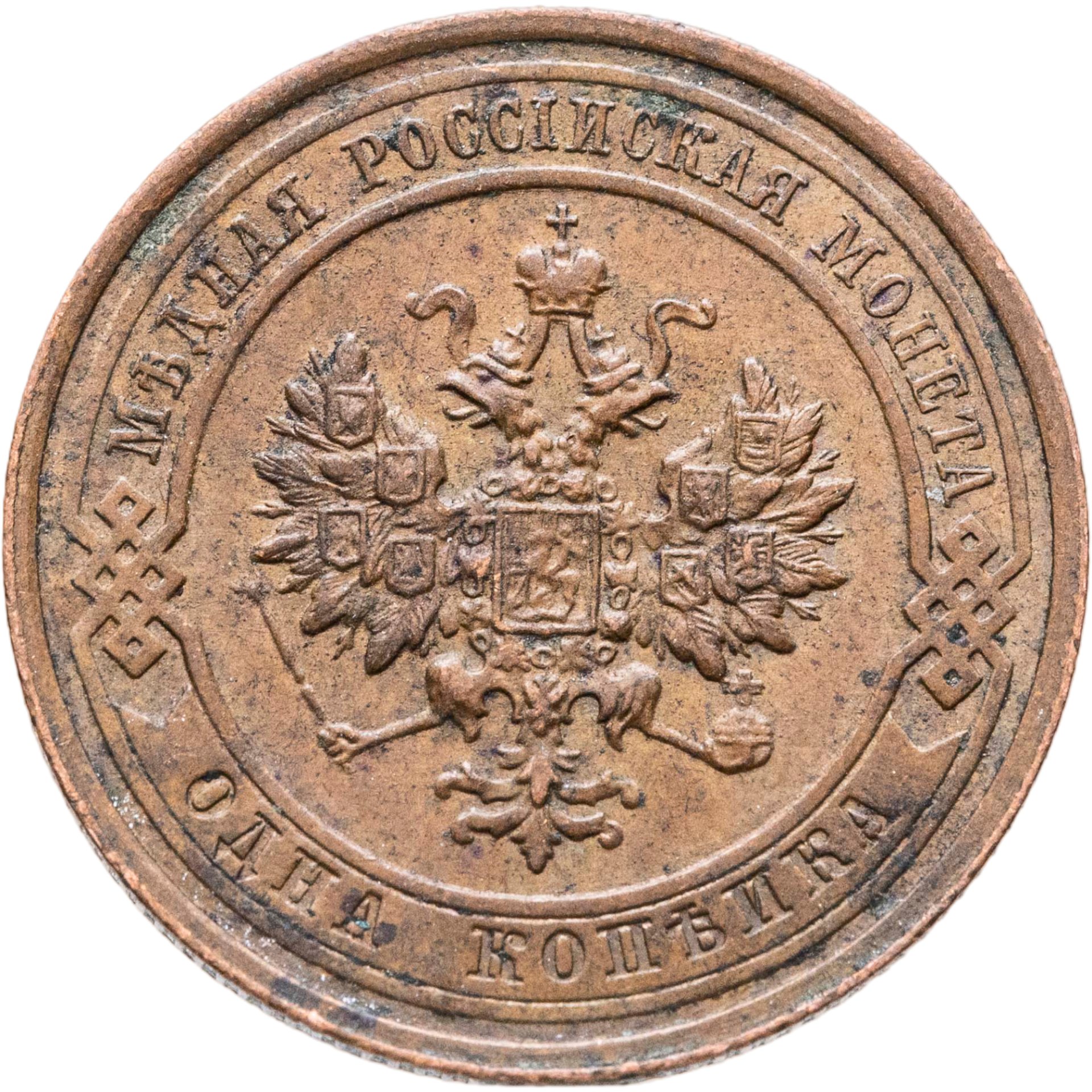 В центре монеты изображен Малый Государственный Герб Российской империи - двуглавый орел, головы которого увенчаны двумя коронами, третья, большая корона над ними. Все они соединены лентой Андрея Первозванного. В правой лапе орла – скипетр, в левой – держава. На его груди расположен Московский герб, в щите изображен Георгий Победоносец с копьем поражающий дракона. Вокруг щита цепь ордена Св. Апостола Андрея Первозванного. На крыльях орла изображены гербы: Царства Казанского, Польского, Херсонеса Таврического, Астраханского, Сибирского, Грузинского и герб соединенных княжеств Киевского, Новгородского и Владимирского — по 4 на каждое крыло. По окружности - две полукруглые плашки, соединенные узорами. На верхней плашке выпуклая надпись: "МЕДНАЯ РОССИЙСКАЯ МОНЕТА". На нижней плашке, изображенной в виде ленты, углубленная надпись: "ОДНА КОПЕЙКА".