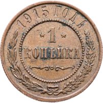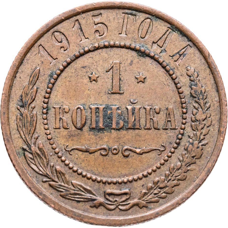 В центре указан номинал — цифра «1», ограниченная с обеих сторон звездочками. Под цифрой номинала — слово "КОПЕЙКА". Ниже, расположен декоративный разделитель в виде двух изогнутых линий и небольшой окружности между ними. Центральная часть отделена от остального изображения, окружностью в виде точек. В верхней части полукругом углубленная надпись: "1915 ГОДА". Ниже этой надписи, вдоль канта, изображен венок из лавровой и дубовой ветвей, которые, в нижней части, перевязаны лентой на узел бантом.