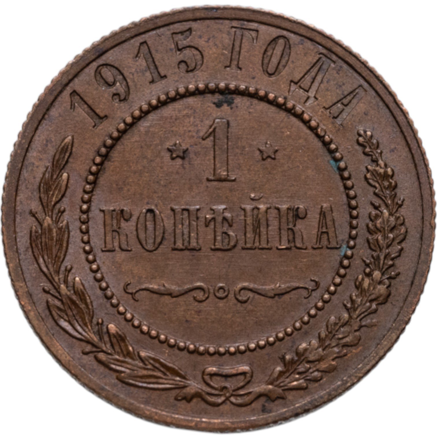 В центре указан номинал — цифра «1», ограниченная с обеих сторон звездочками. Под цифрой номинала — слово "КОПЕЙКА". Ниже, расположен декоративный разделитель в виде двух изогнутых линий и небольшой окружности между ними. Центральная часть отделена от остального изображения, окружностью в виде точек. В верхней части полукругом углубленная надпись: "1915 ГОДА". Ниже этой надписи, вдоль канта, изображен венок из лавровой и дубовой ветвей, которые, в нижней части, перевязаны лентой на узел бантом.