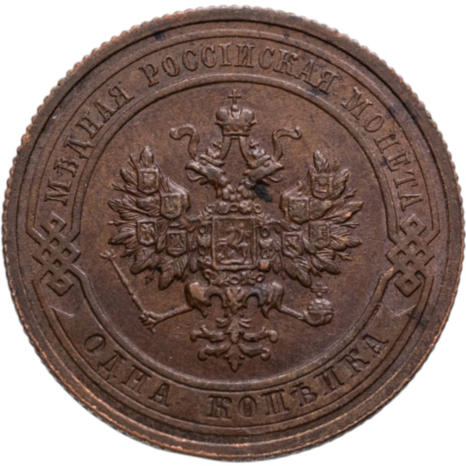 В центре монеты изображен Малый Государственный Герб Российской империи - двуглавый орел, головы которого увенчаны двумя коронами, третья, большая корона над ними. Все они соединены лентой Андрея Первозванного. В правой лапе орла – скипетр, в левой – держава. На его груди расположен Московский герб, в щите изображен Георгий Победоносец с копьем поражающий дракона. Вокруг щита цепь ордена Св. Апостола Андрея Первозванного. На крыльях орла изображены гербы: Царства Казанского, Польского, Херсонеса Таврического, Астраханского, Сибирского, Грузинского и герб соединенных княжеств Киевского, Новгородского и Владимирского — по 4 на каждое крыло. По окружности - две полукруглые плашки, соединенные узорами. На верхней плашке выпуклая надпись: "МЕДНАЯ РОССИЙСКАЯ МОНЕТА". На нижней плашке, изображенной в виде ленты, углубленная надпись: "ОДНА КОПЕЙКА".