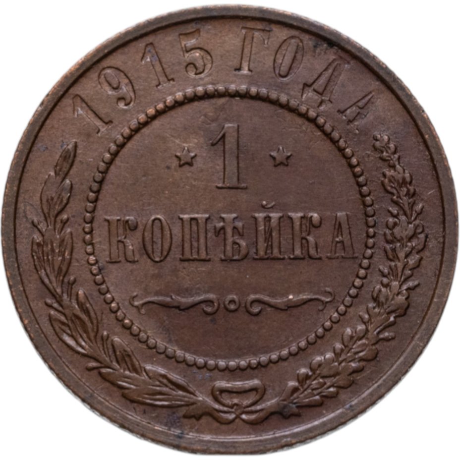В центре указан номинал — цифра «1», ограниченная с обеих сторон звездочками. Под цифрой номинала — слово "КОПЕЙКА". Ниже, расположен декоративный разделитель в виде двух изогнутых линий и небольшой окружности между ними. Центральная часть отделена от остального изображения, окружностью в виде точек. В верхней части полукругом углубленная надпись: "1915 ГОДА". Ниже этой надписи, вдоль канта, изображен венок из лавровой и дубовой ветвей, которые, в нижней части, перевязаны лентой на узел бантом.